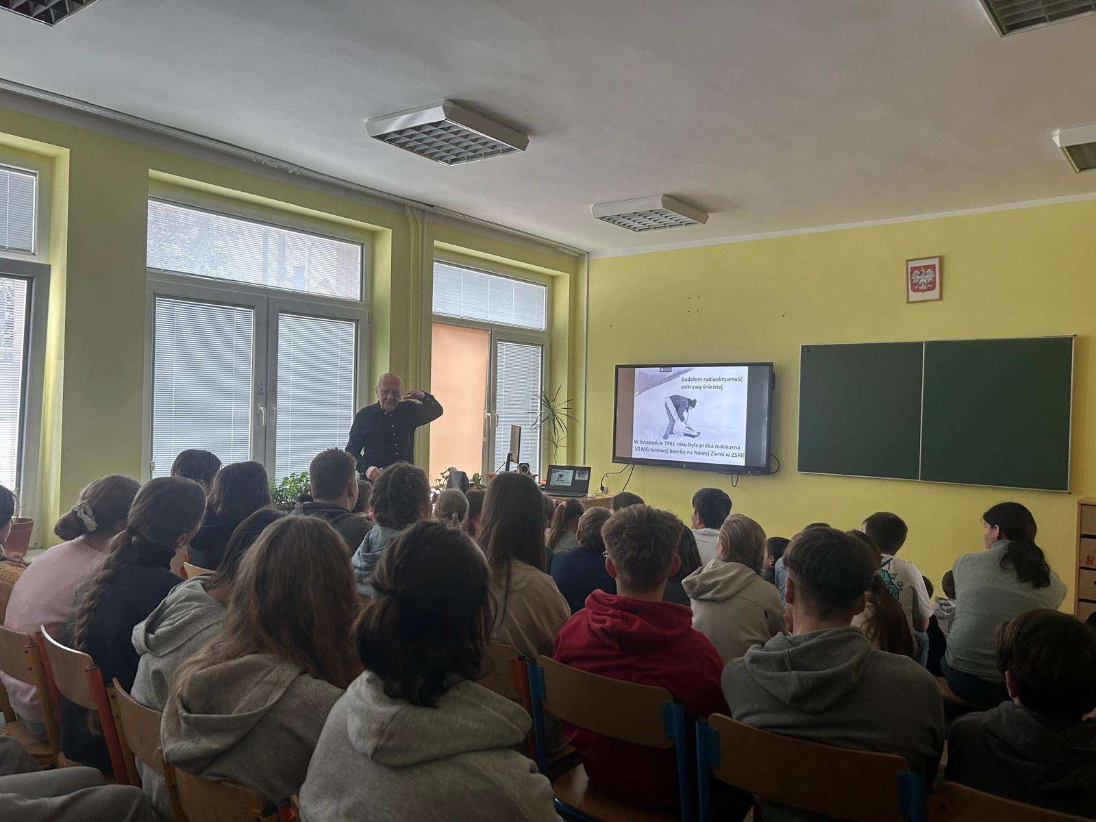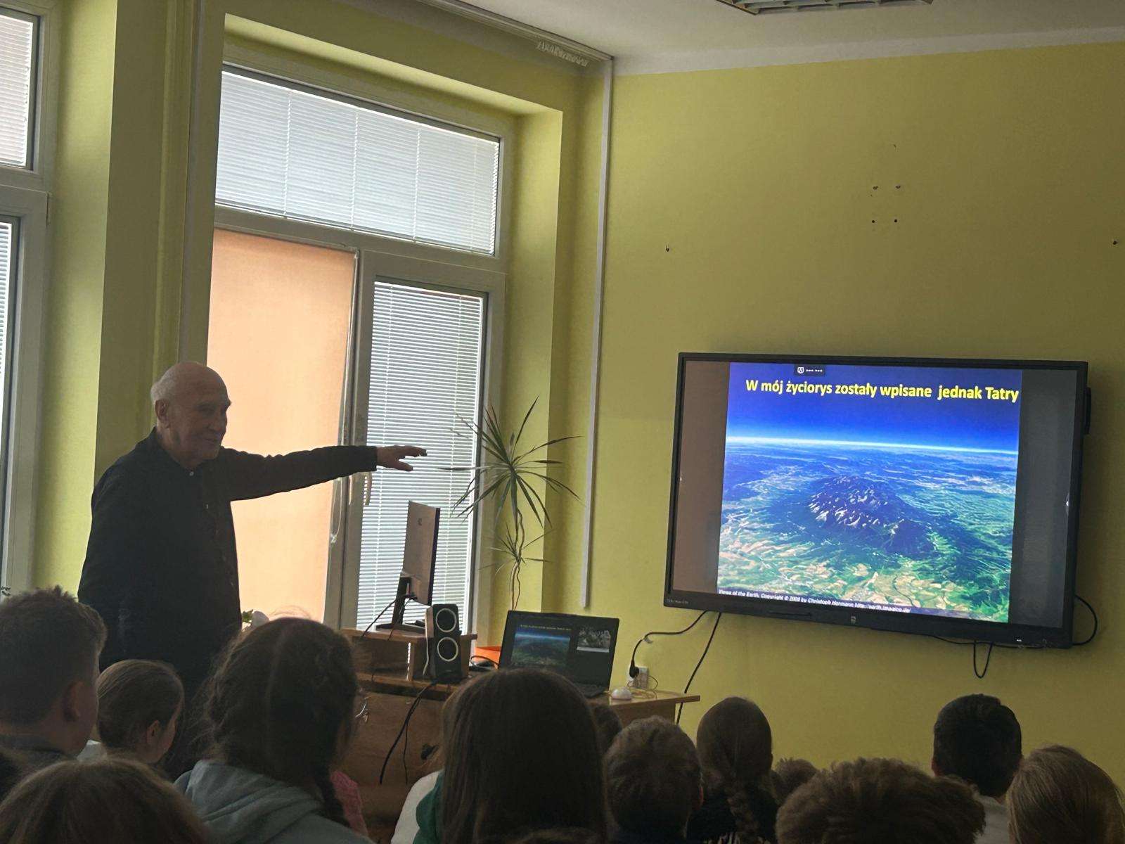 13 stycznia 2026 r. z okazji Międzynarodowego Dnia Terenów Górskich (przypadającego 11 grudnia), odbyło się w naszej szkole spotkanie z Panem Apoloniuszem Rajwą, legendą Tatr i Zakopanego. Człowiek wielu profesji - przewodnik tatrzański, ratownik TOPR, speleolog, dziennikarz, nauczyciel, pracownik obserwatorium meteorologicznego na Kasprowym Wierchu, wspaniały gawędziarz. Pan Apoloniusz pokazał nam ciekawą prezentację o swojej działalności i karierze zawodowej, wzbogaconą ciekawostkami, anegdotami i dobrymi radami dla miłośników górskich wędrówek. Spotkanie było niezwykle inspirujące dla słuchaczy, nie tylko dla młodego pokolenia. Kto wie, spotkanie z naszym Gościem, możliwość rozmowy z nim i zadania pytań może przyczyni się do wzrostu zainteresowania naszym regionem, a także będzie wskazówką podczas wyboru w przyszłości swojej drogi zawodowej. Pan Apoloniusz to wspaniały przykład człowieka, który potrafi łączyć pasję z pracą zawodową.