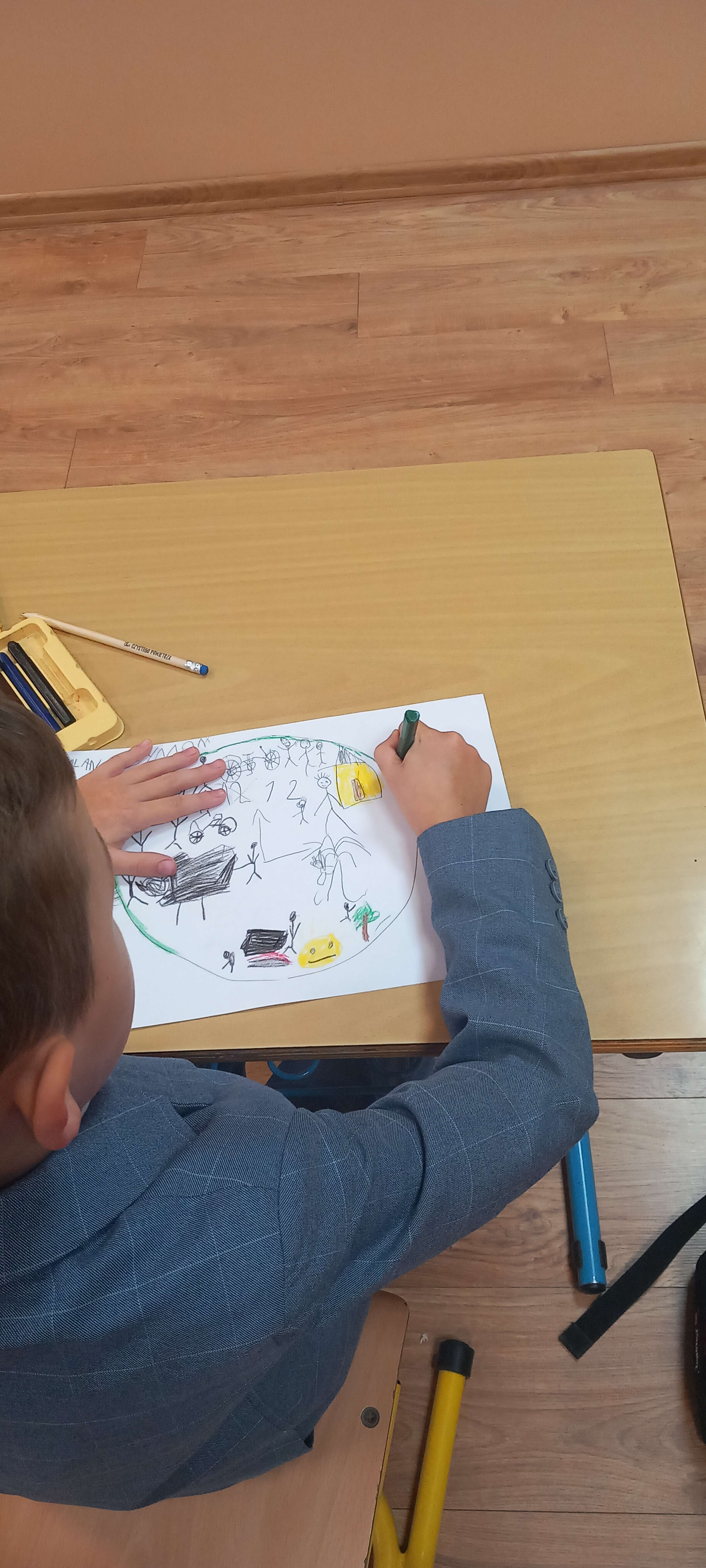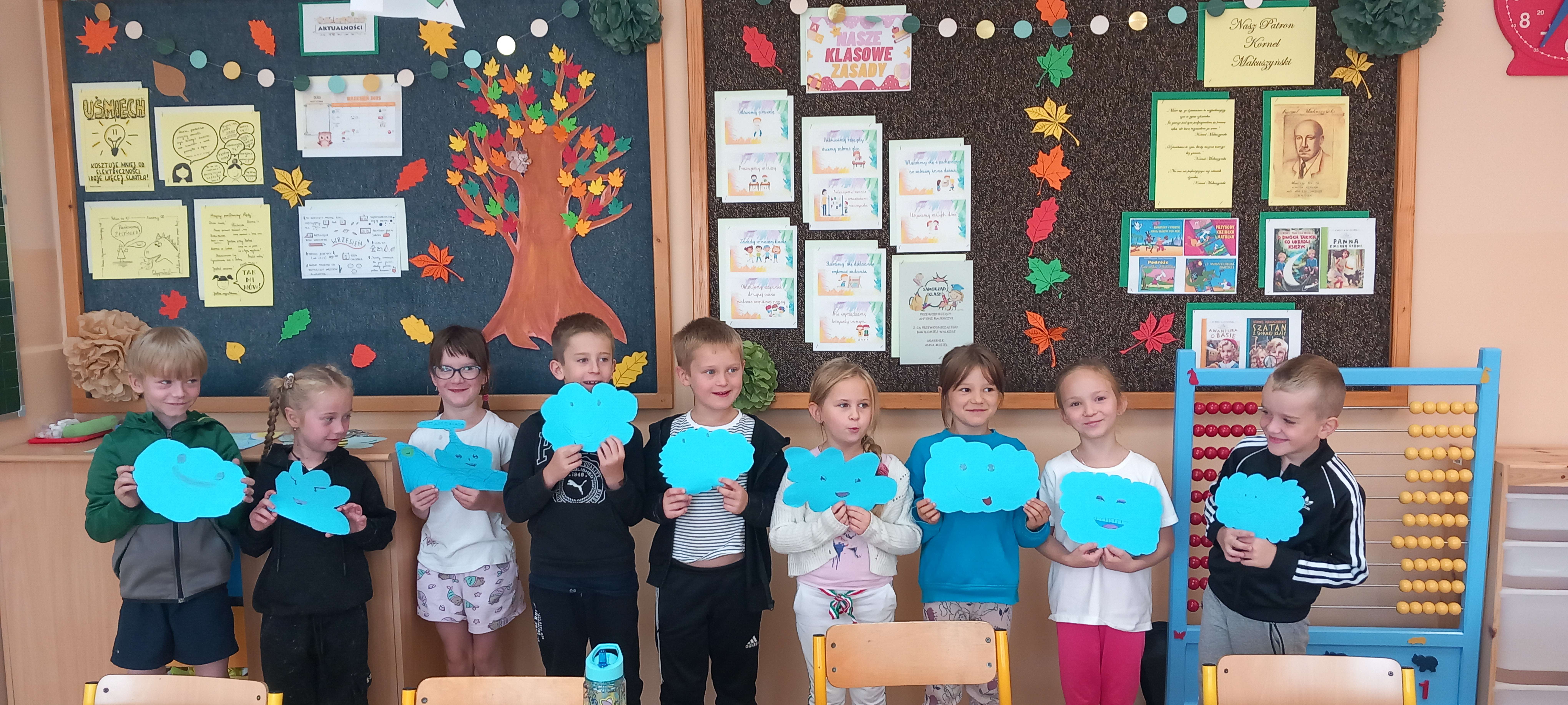 Dodatkowo uczniowie wzięli udział w wyjątkowym zadaniu przyjacielskim „Parasol Dobrych Słów”. Każde dziecko zapisało na wspólnym parasolu słowo lub zdanie, które chciałoby usłyszeć od przyjaciela. Parasol został zawieszony w klasie jako symbol wspólnoty i przyjaźni, a dzieci są zachęcane do regularnego uzupełniania go nowymi, pozytywnymi słowami.