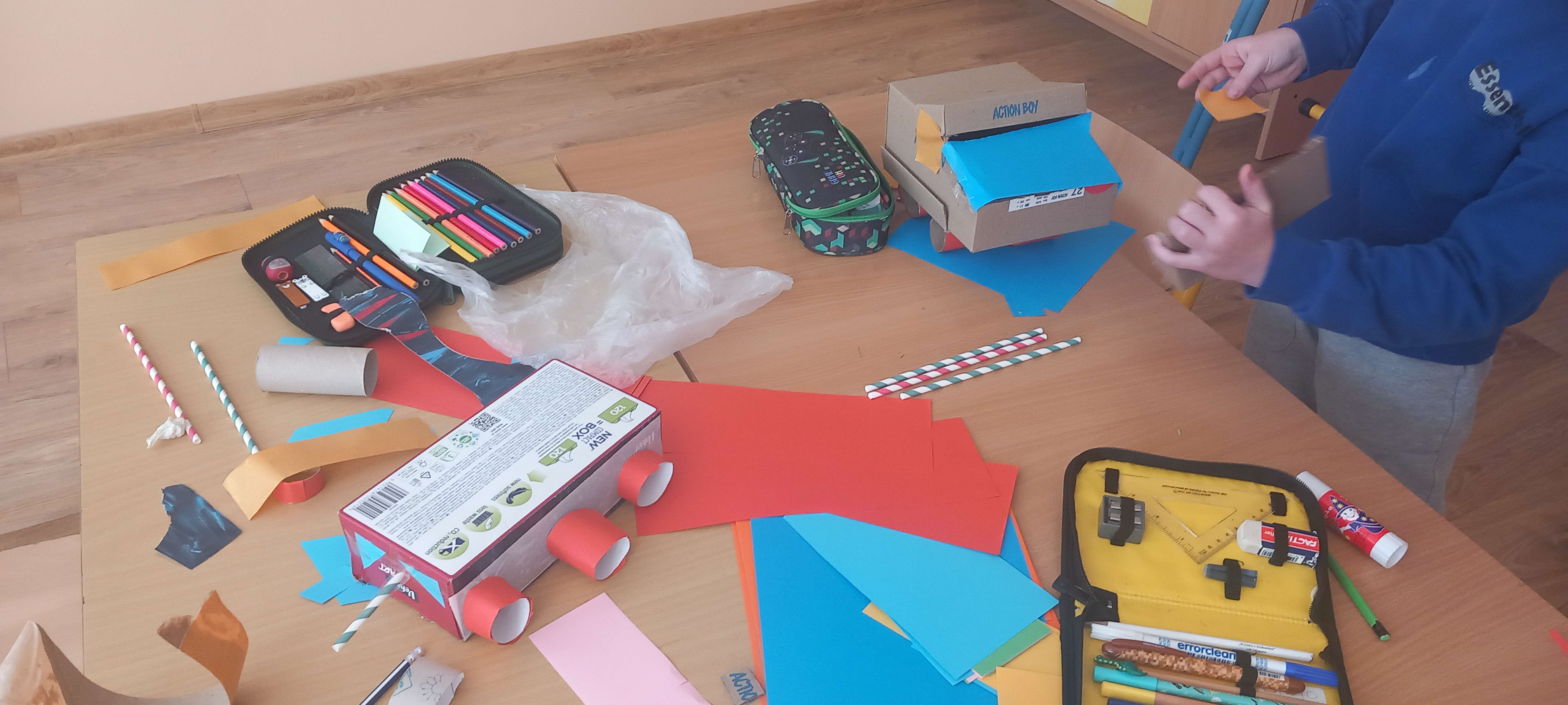 Nie zabrakło również działań konstrukcyjnych i inżynierskich – uczniowie wymyślili, zaprojektowali i wykonali z dowolnych materiałów maszynę, która mogłaby pomóc bohaterowi książki rozwiązać jego największy problem. Każda maszyna otrzymała nazwę, a dzieci zaprezentowały jej działanie i funkcje w formie ustnej, co dodatkowo rozwijało ich kompetencje komunikacyjne i umiejętność prezentacji.