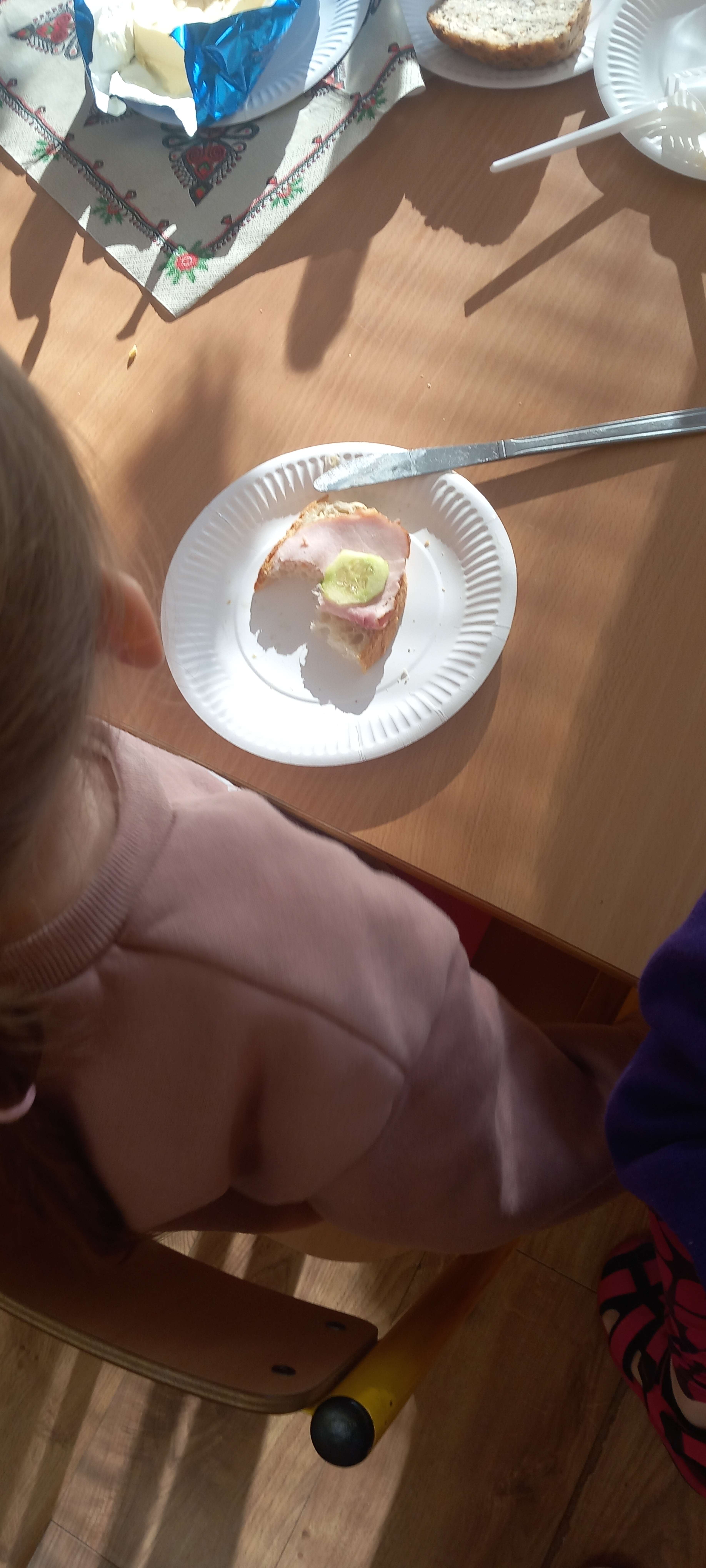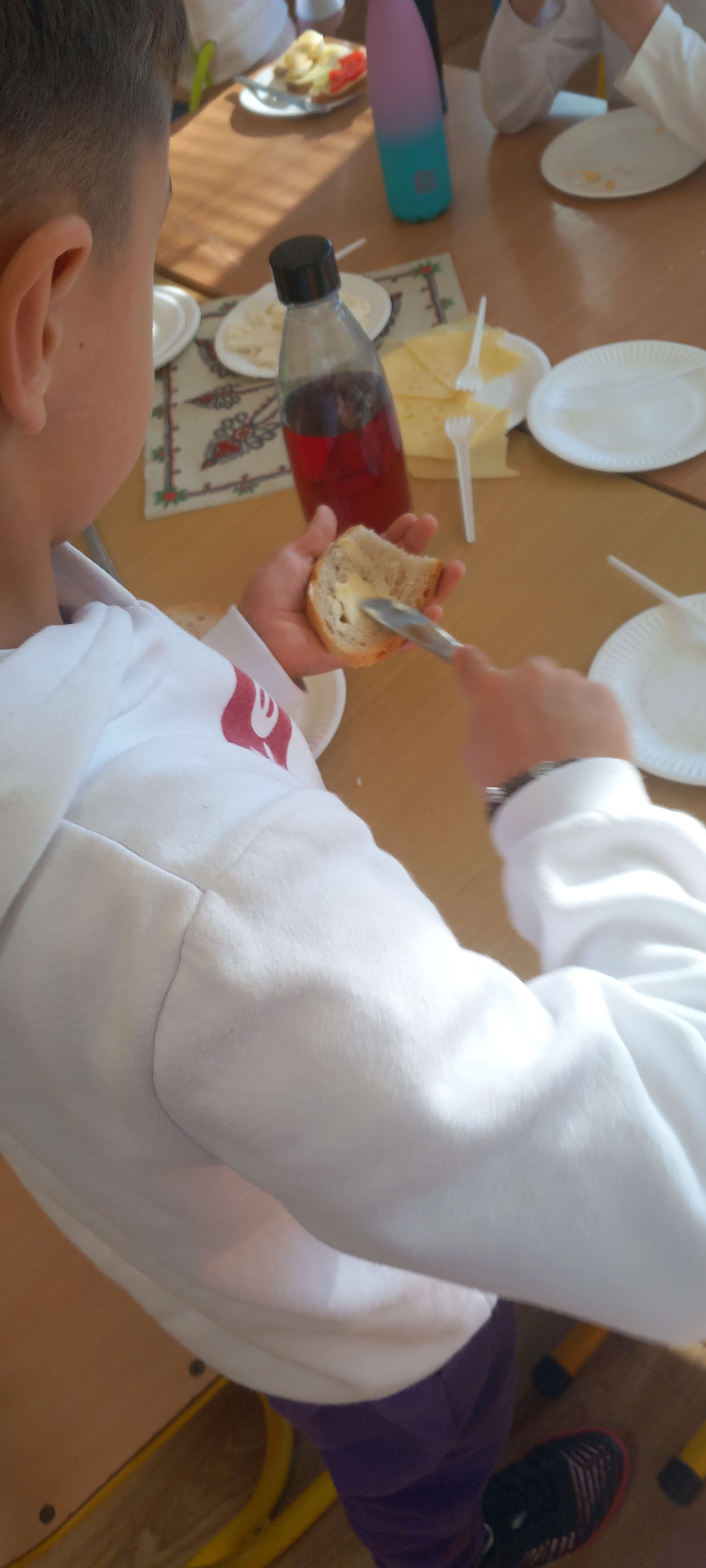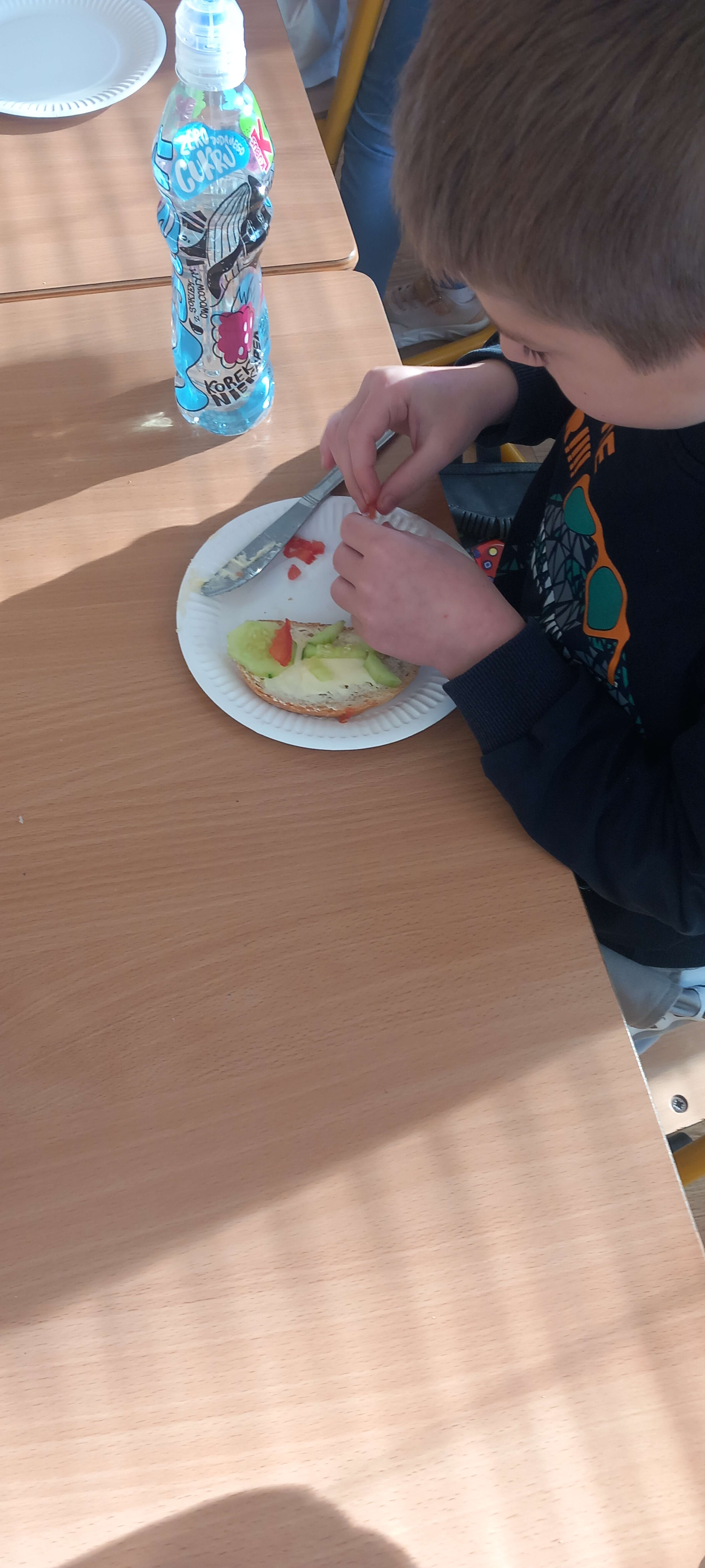 Dzieci przyniosły na lekcję różnorodne produkty — świeże warzywa, pieczywo, sery, wędliny, jajka i dżemy. Każdy uczeń samodzielnie przygotował dla siebie pyszną i kolorową kanapkę, komponując ją według własnego pomysłu. W klasie unosił się zapach świeżego pieczywa, a na talerzach pojawiły się prawdziwe małe dzieła sztuki kulinarnej!