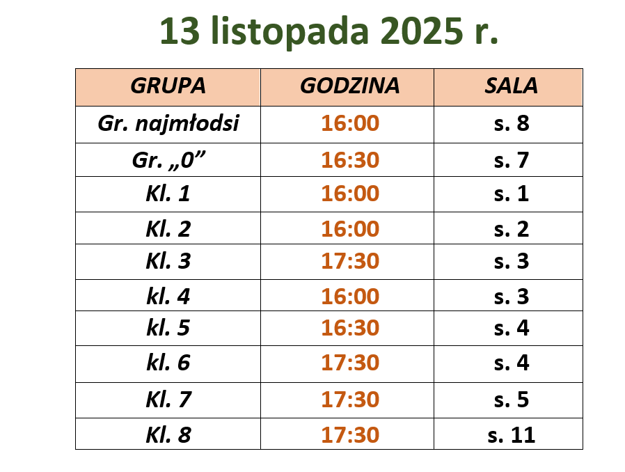 Zapraszamy na zebrania z rodzicami, które odbędą się 13 listopada 2025 r. (czwartek) według planu: