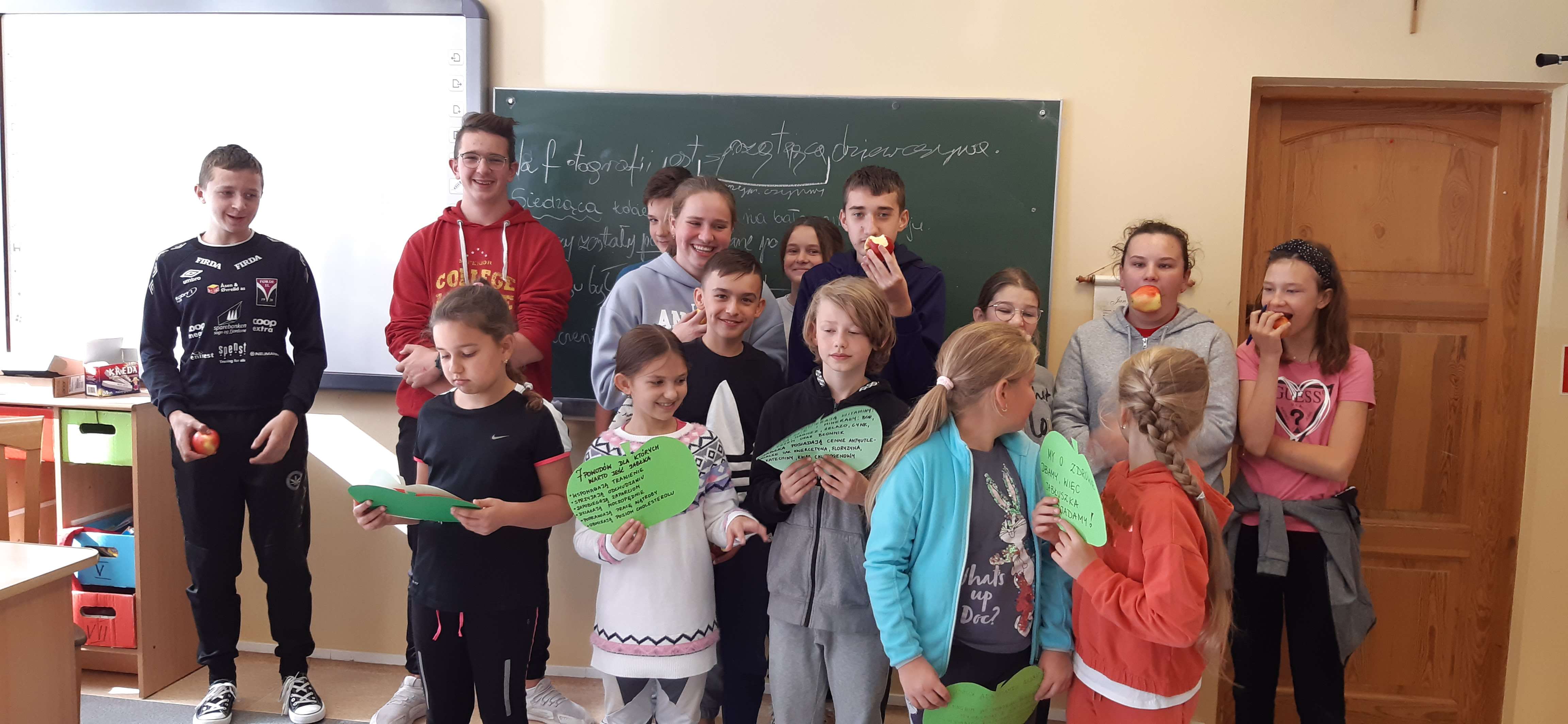 Dnia 28 września obchodziliśmy w naszej szkole ŚWIATOWY DZIEŃ JABŁKA. W tym dniu uczniowie klasy 3 w każdej klasie zaprezentowali różne ciekawostki dotyczące jabłek i częstowali wszystkich uczniów, Panią Dyrektor, nauczycieli i pracowników szkoły tymi pysznymi owocami. Przeprowadzona akcja poszerzyła wiedzę uczniów na temat walorów zdrowotnych i odżywczych jabłek oraz zachęciła do codziennego spożywania tych smacznych owoców. Uczniowie klas 1-3 wykonali bardzo ciekawe prace pt. „Jabłko” dowolną techniką plastyczną.