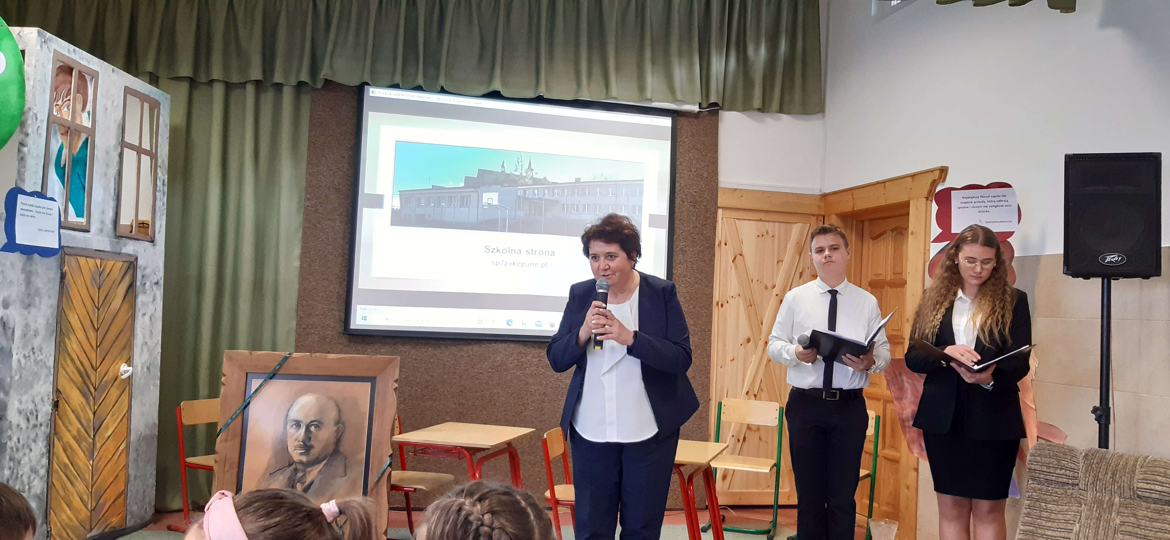 Po zakończeniu części artystycznej nastąpiło składanie życzeń przez zaproszonych gości. Padło wiele ciepłych słów kierowanych do Pani Dyrektor oraz do całej społeczności szkolnej. Przewodniczący Rady Miasta Zakopane Jan Gluc oraz Naczelnik Wydziału Oświaty i Spraw Społecznych Aneta Zwijacz-Kozica, którzy w imieniu Burmistrza i jego zastępców przekazali na ręce dyrektor obraz namalowany przez Monikę Stanisławską-Pitoń przedstawiający patrona szkoły.