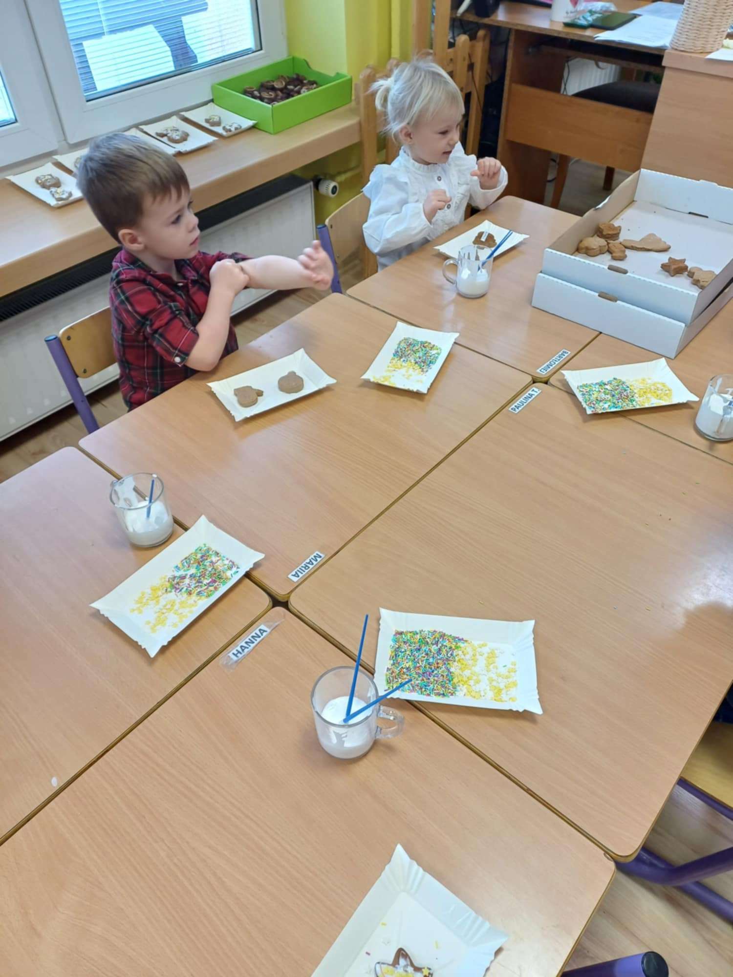 6 grudnia przed wizytą św. Mikołaja przedszkolaki z grupy młodszej oraz grupy „0” w wesołych humorach ozdabiały pierniki dla św. Mikołaja. Po rozdaniu prezentów przez św. Mikołaja nasz gość wybrał pierniki, które mu się najbardziej podobały.