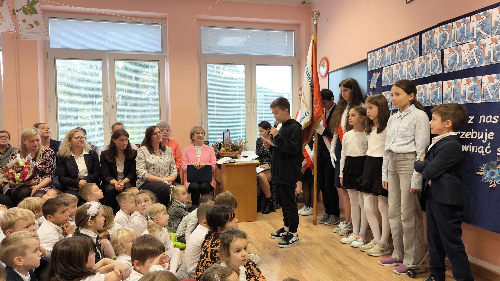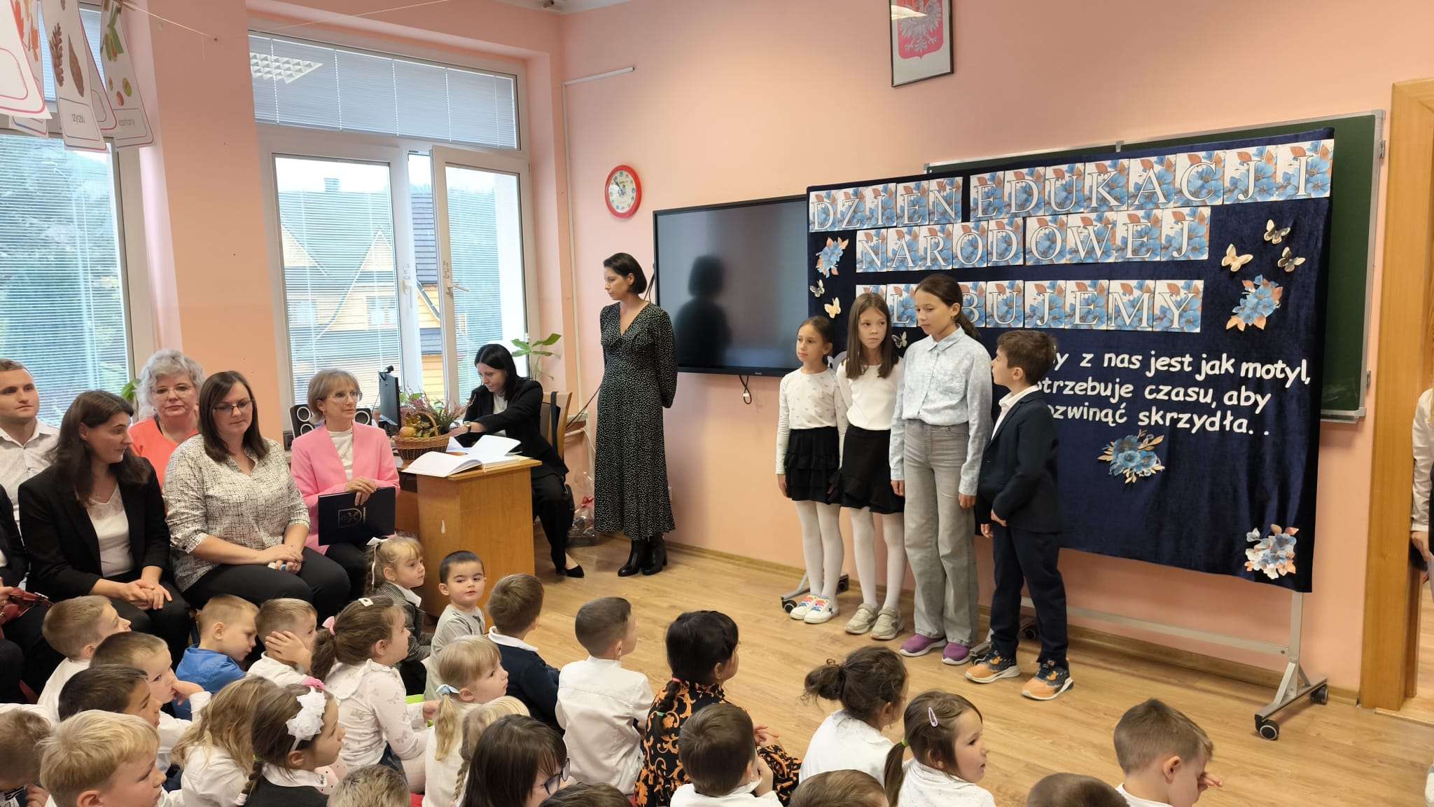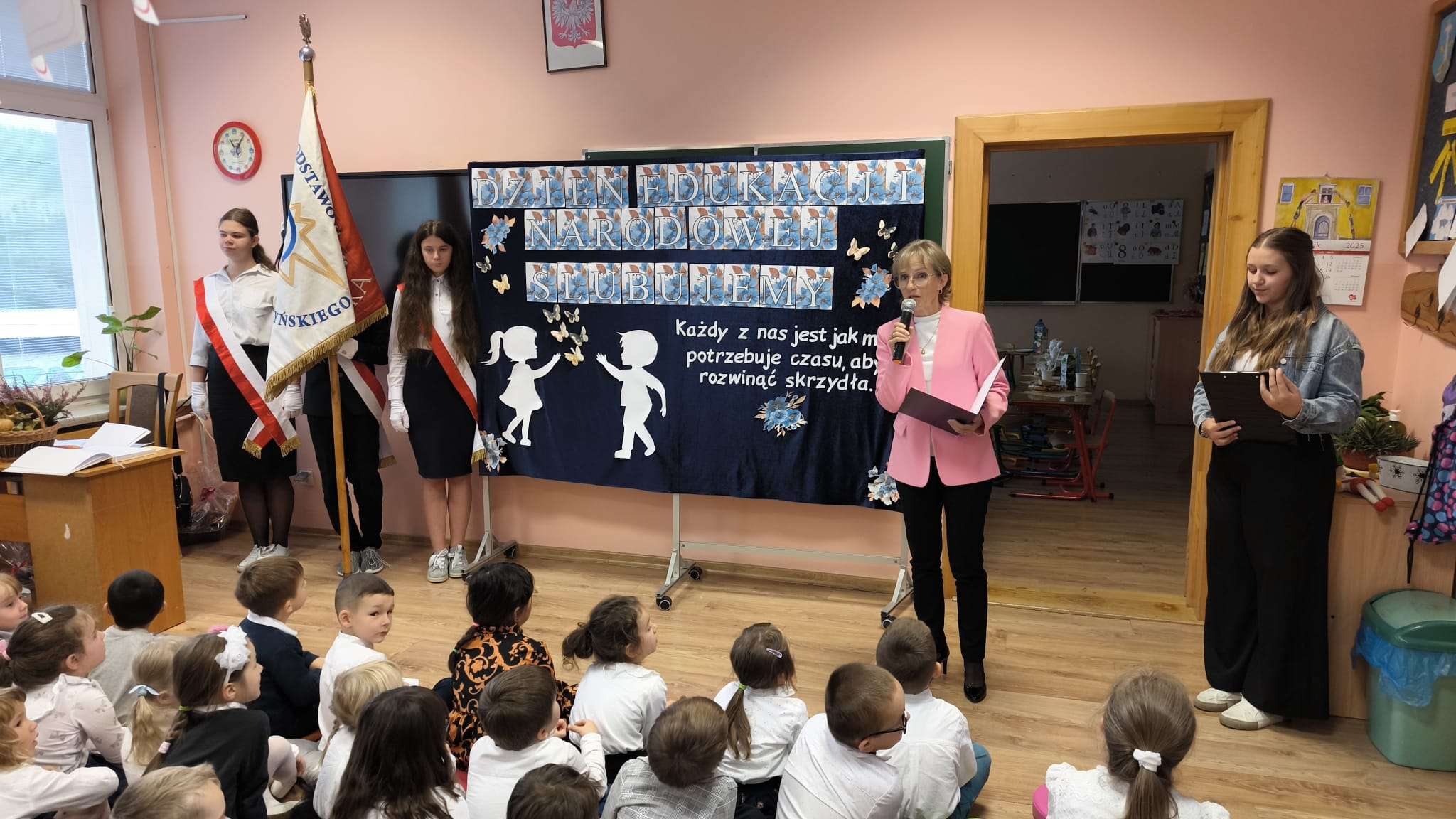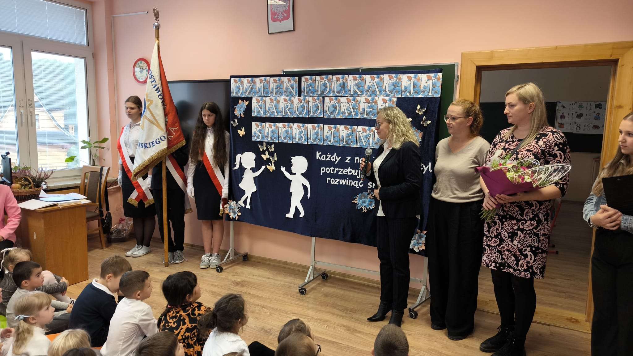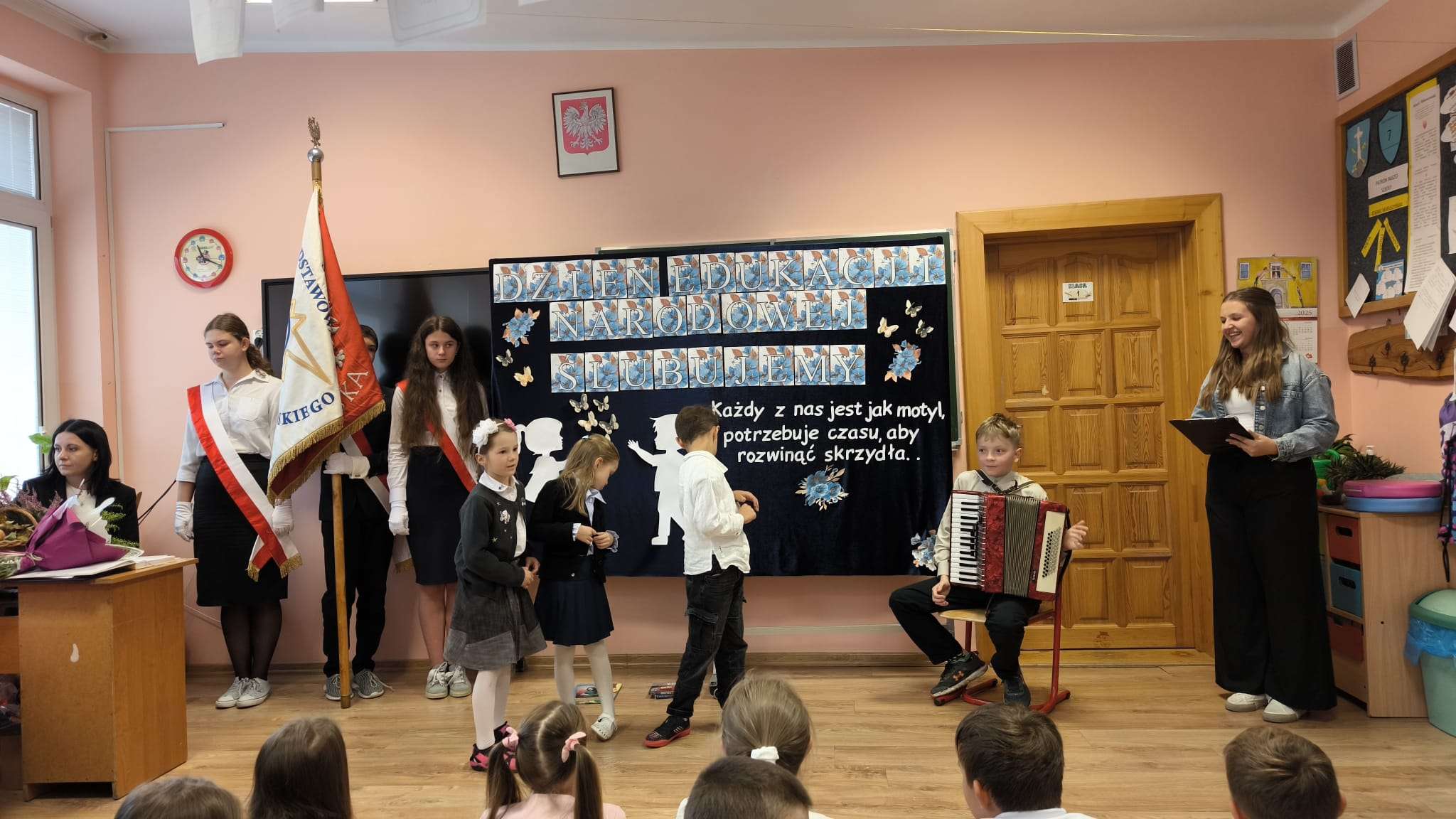 Z okazji tego święta w naszej szkole odbyła się uroczysta akademia. Uczniowie klasy IV wraz z wychowawczynią przygotowali krótkie przedstawienie będące podziękowaniem dla wszystkich nauczycieli oraz pracowników szkoły. Dzieci w humorystyczny sposób złożyły życzenia oraz zaśpiewały dwie piosenki, poprzez które wyraziły wdzięczność za trud wkładany w ich edukację.