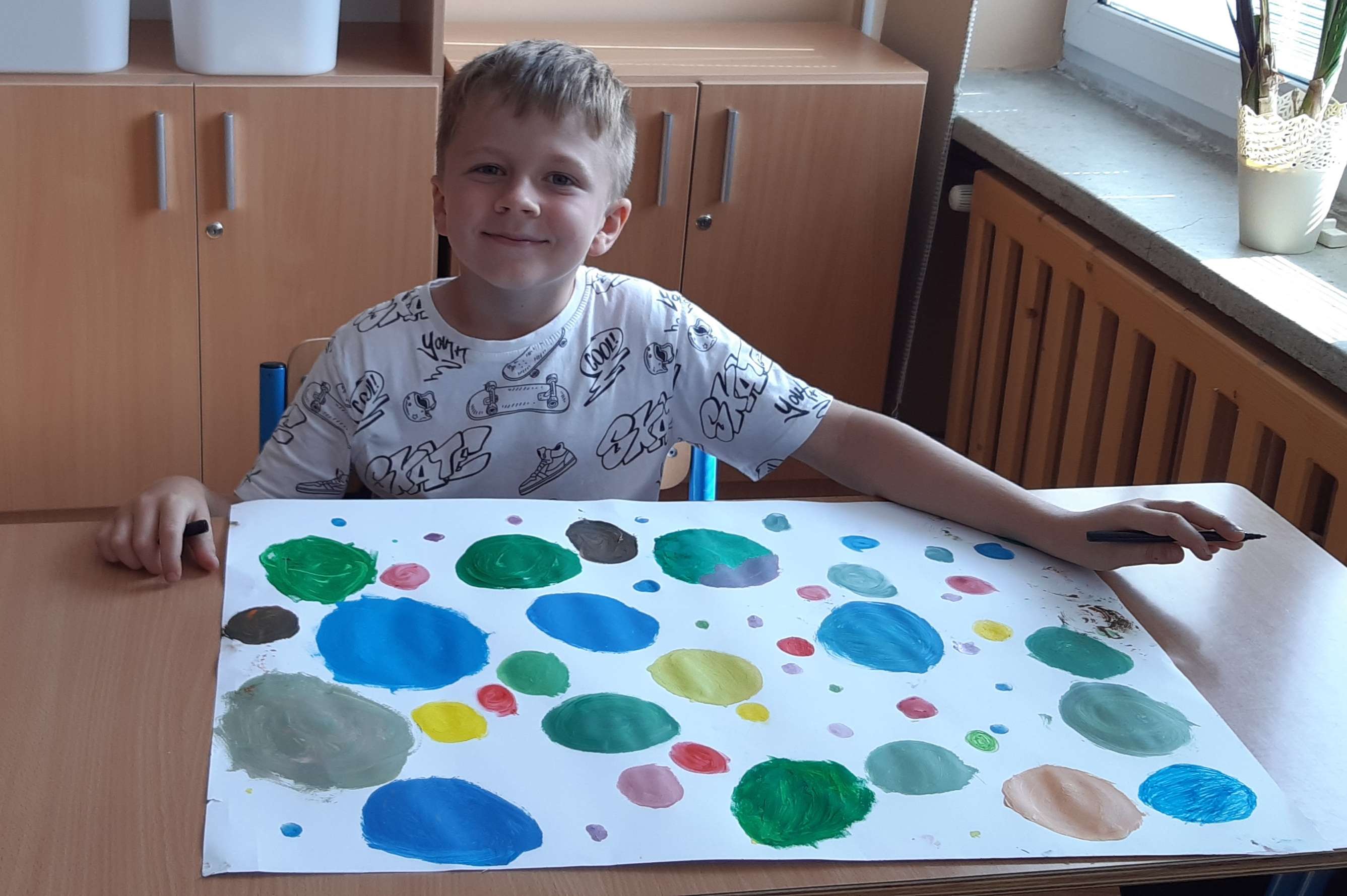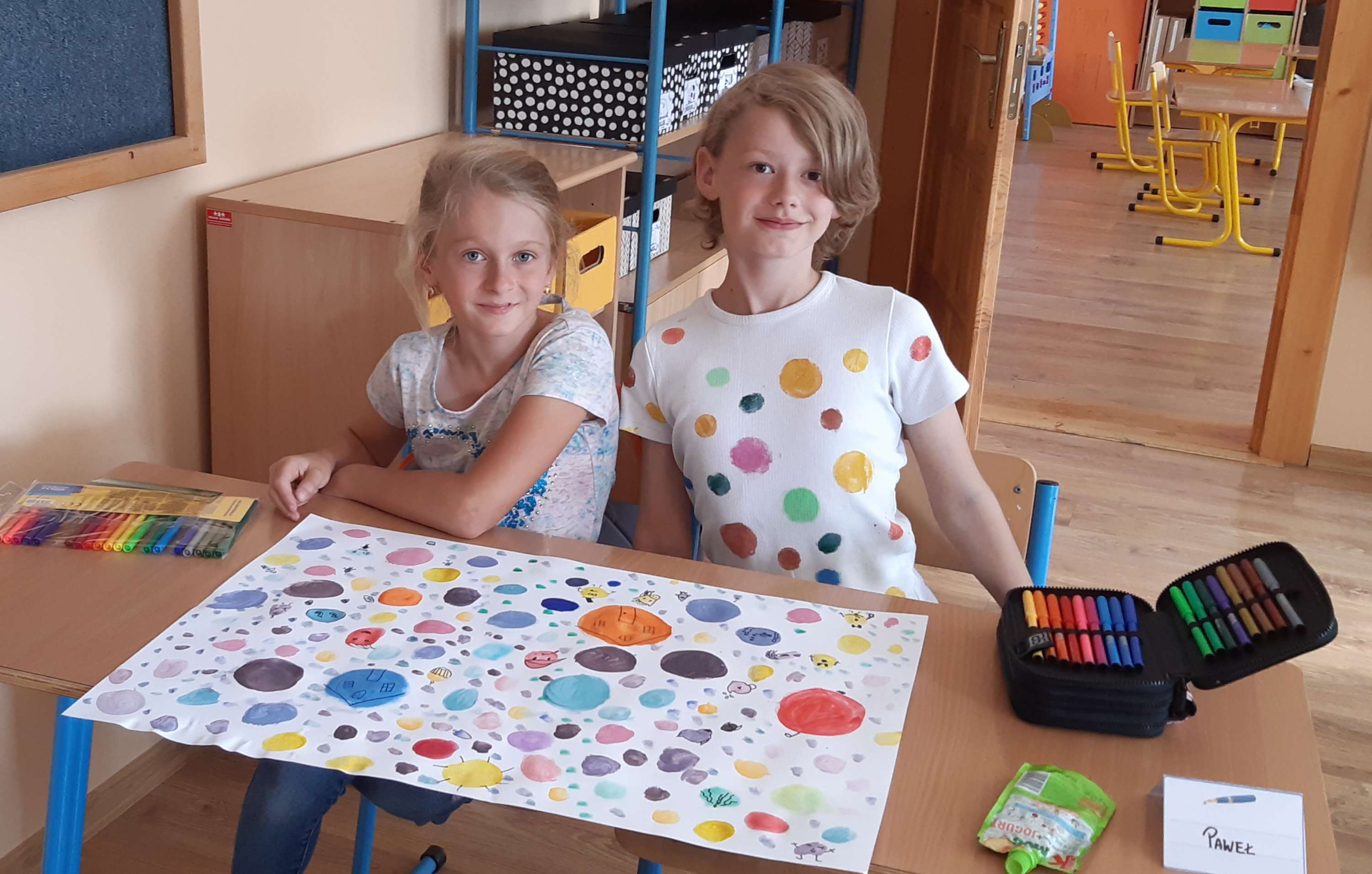 Dnia 15 września 2021 r. uczniowie klas 1-3 obchodzili MIĘDZYNARODOWY DZIEŃ KROPKI, który ma na celu pomóc dzieciom w odkrywaniu talentów i poznaniu swoich mocnych stron. Motywem przewodnim jest KROPKA. Inspiracją do obchodzenia tego święta stała się książka napisana i zilustrowana przez Petera H. Raynoldsa „Kropka”. To historia Yashti, dziewczynki, która nie wierzy we własne możliwości. Uczniowie klas 1-3 obejrzeli film o Yashi, rozmawiali o swoich talentach, a potem wykonywali prace plastyczne i rozwiązywali łamigłówki matematyczne.
