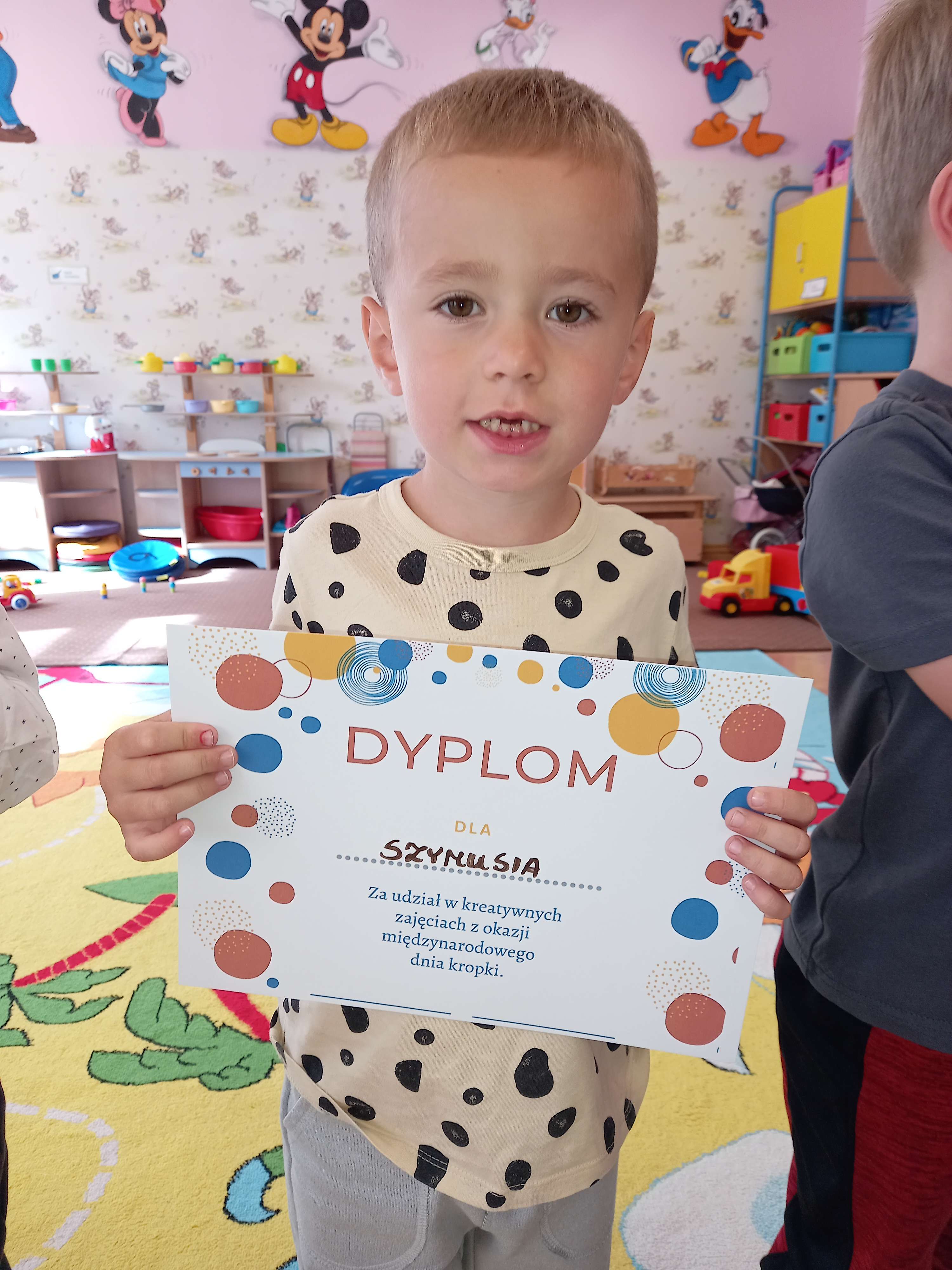 15 września obchodziliśmy w przedszkolu Międzynarodowy Dzień Kropki. Dzień był wyjątkowy i troszkę inny, niż zwykle. Na pewno zastanawiające jest, jak przebiegał i co nowego wniósł w życie przedszkolaków. Naszym celem ukierunkowanym na zadania było rozbudzanie kreatywności, aktywności twórczej, pomysłowości, a przede wszystkim zachęcanie wszystkich do podejmowania działania, inicjatywy – po prostu tworzenia. Dzień Kropki, to dzień odwagi, wiary we własne możliwości, rozumienia swojej wartości poprzez odpowiednie zabawy . Dzień wypełniony był kolorowymi kropkami. Wszystkie dzieci i pracownicy przedszkola zaangażowali się w zabawę. Nauczyciele podczas zajęć dydaktycznych przedstawiali genezę – charakterystykę i znaczenie tego dnia. Z ogromną uwagą przedszkolaki słuchały opowiadania o zwyczajnej, małej kropce, która tak bardzo zmieniła życie pewnej dziewczynki o imieniu Vashti. Ta niezwykła historia uświadomiła naszym maluchom, że każdy człowiek – mały i duży – ma swoją wartość. Każde dziecko ma zdolności, talenty, choć czasem bardzo ukryte. Każde dziecko jest wartościowe! Na uwagę zasługuje fakt, że tego dnia kropki zauważaliśmy wszędzie, nawet tam, gdzie wcześniej wcale ich nie dostrzegaliśmy. Czasem przecież nawet nie zwracaliśmy na nie uwagę. Okazało się, że kropki towarzyszą nam w naszym codziennym życiu: są na skrzydełkach biedronki, są w koronie króla, a nawet zdobią kapelusz muchomora. Tego dnia przedszkolaki, poza liczeniem kropek, wykonały także prace plastyczne z kropką w roli głównej.