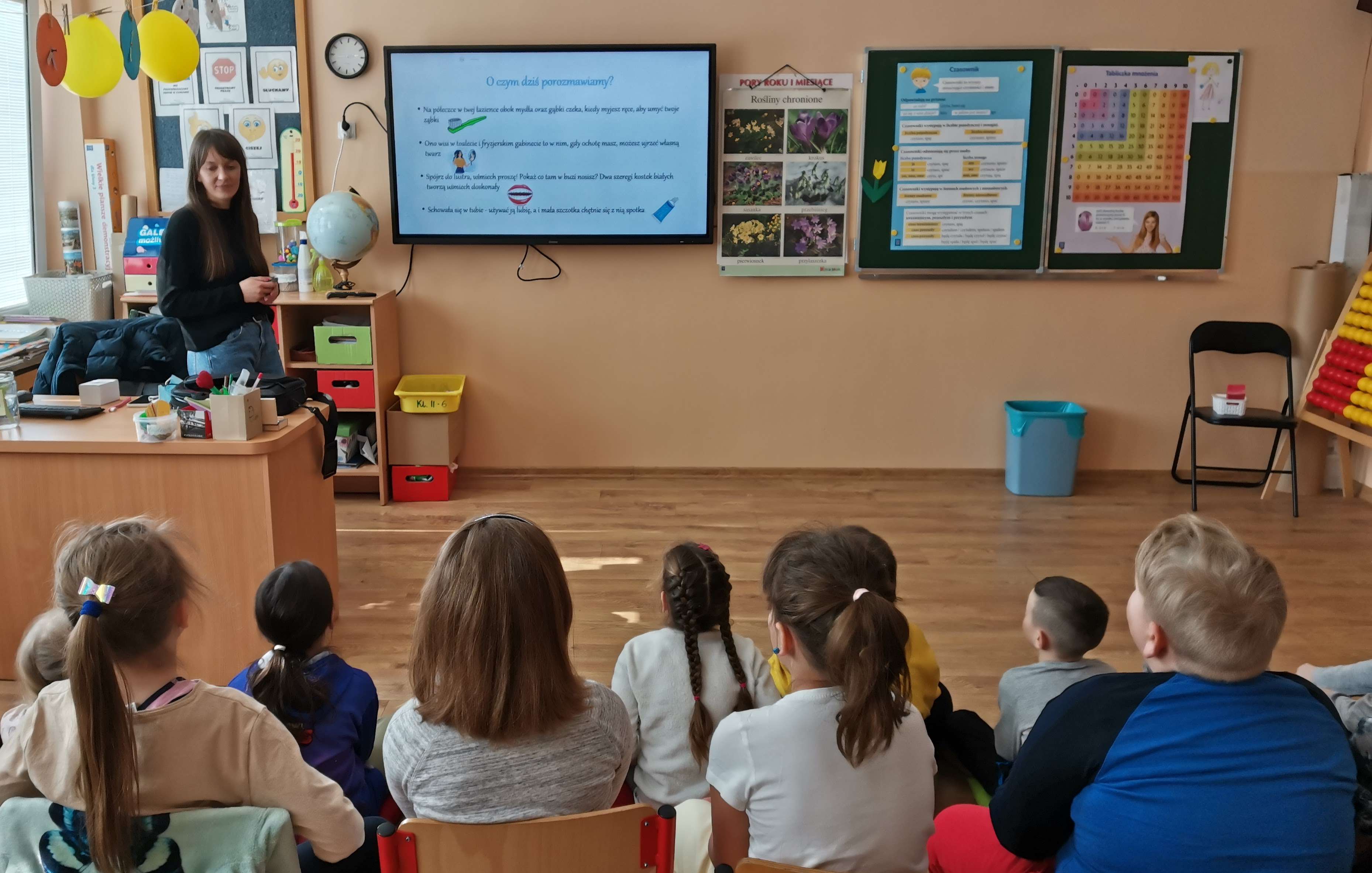 W dniu 18 marca w klasach 1-3 odbyła się prelekcja na temat higieny jamy ustnej. Pani opowiedziała dzieciom jak należy dbać o higienę jamy ustnej, jaka jest najlepsza technika mycia zębów. Dzieci słuchały z dużym zainteresowaniem dzieląc się własnymi doświadczeniami z pobytu u stomatologa i wiedzy na temat mycia zębów oraz dbania o nie. Dowiedziały się również , jaki wpływ na zdrowie i zęby ma higiena osobista. Serdecznie dziękujemy za cenne wskazówki, które na pewno wykorzystamy w praktyce.