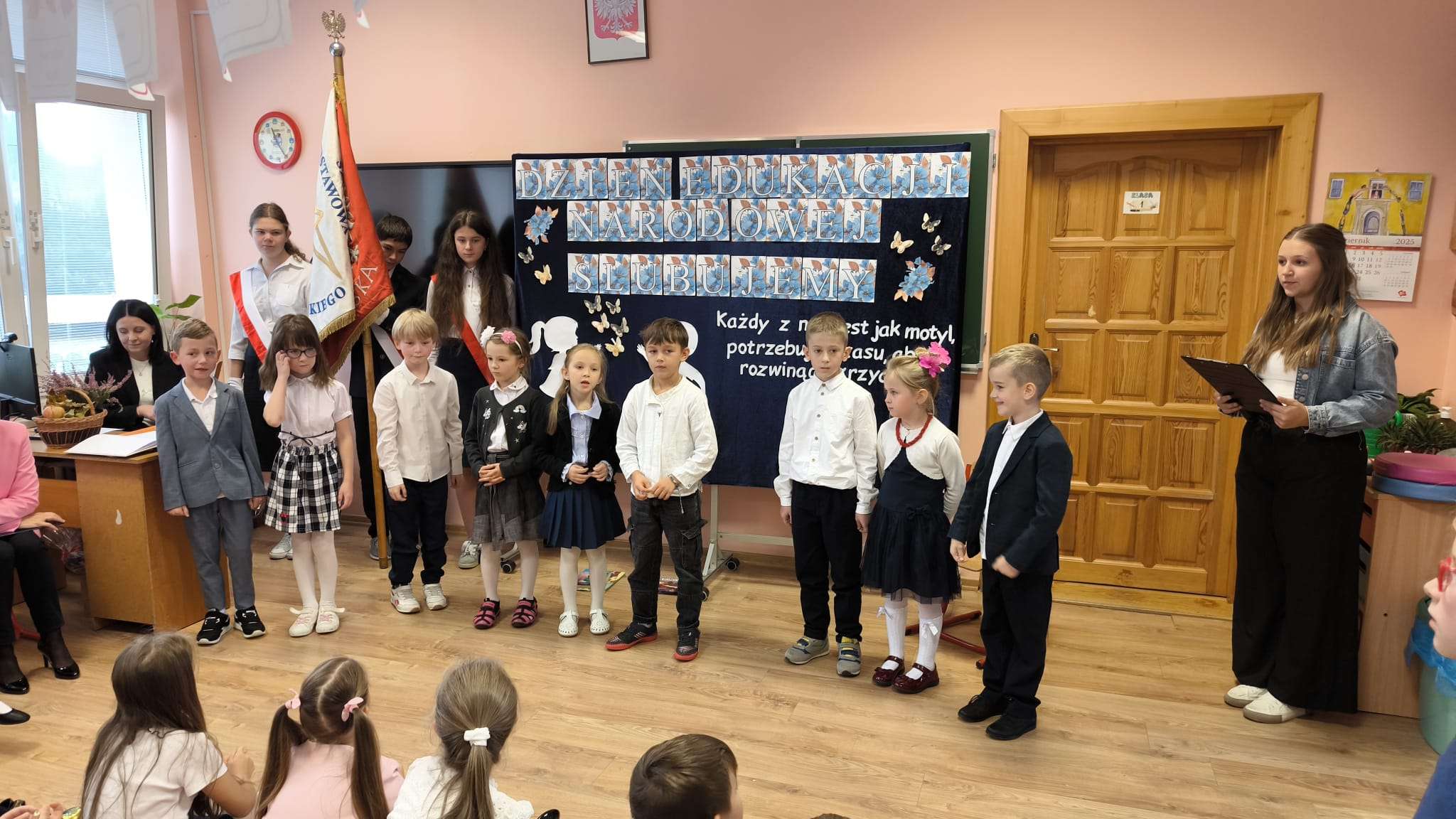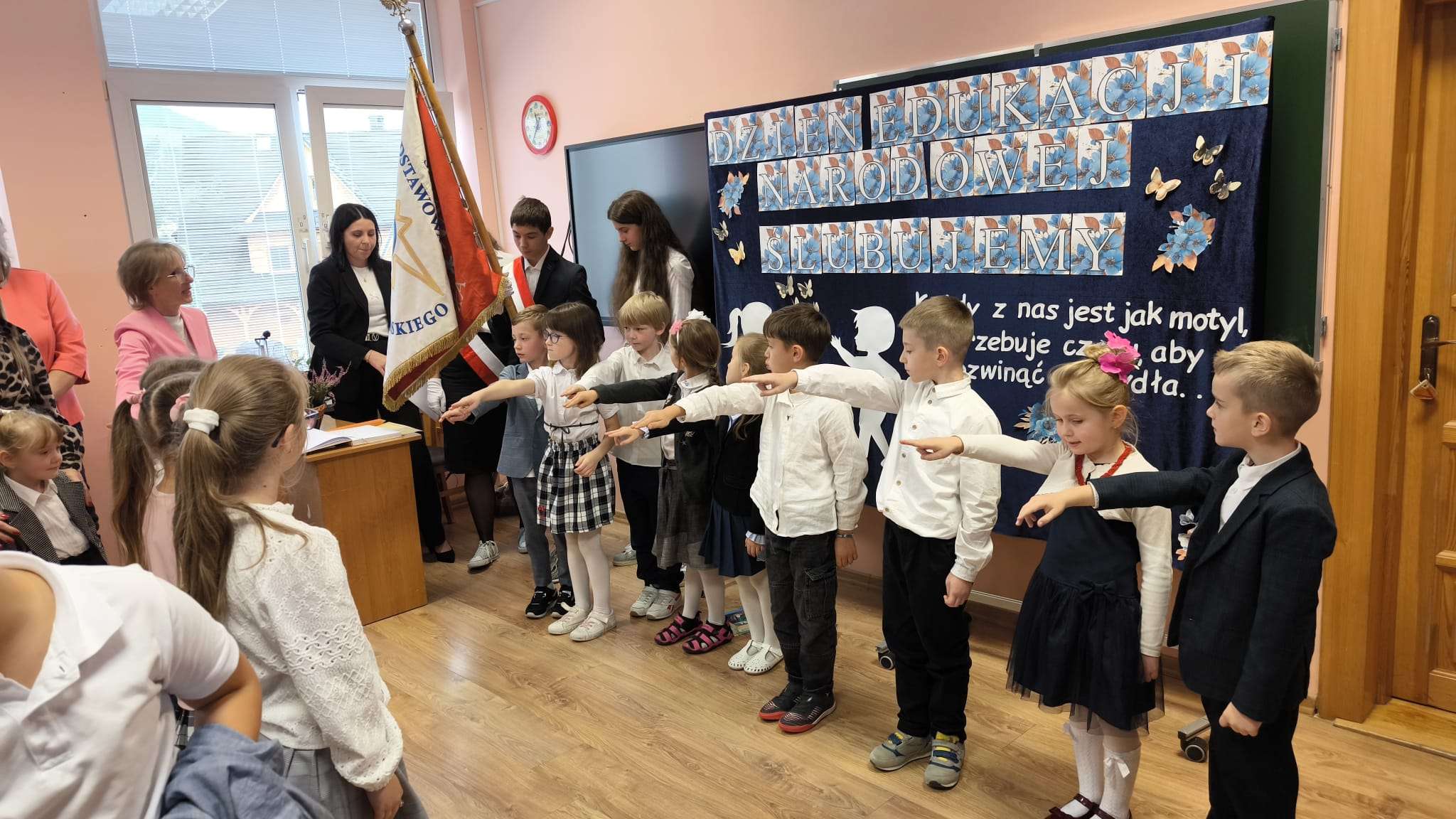 Pierwszoklasiści, w odświętnych strojach, zaprezentowali krótki program artystyczny, po którym złożyli uroczyste ślubowanie na sztandar szkoły. Pani Dyrektor dokonała symbolicznego pasowania na ucznia, a nowi członkowie szkolnej społeczności otrzymali pamiątkowe upominki.