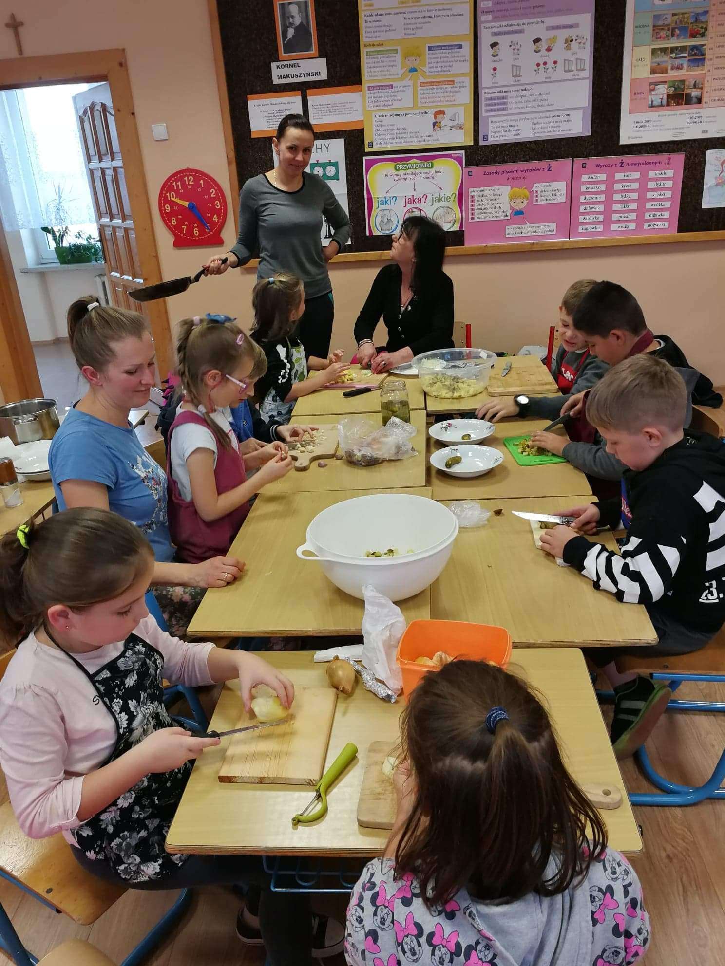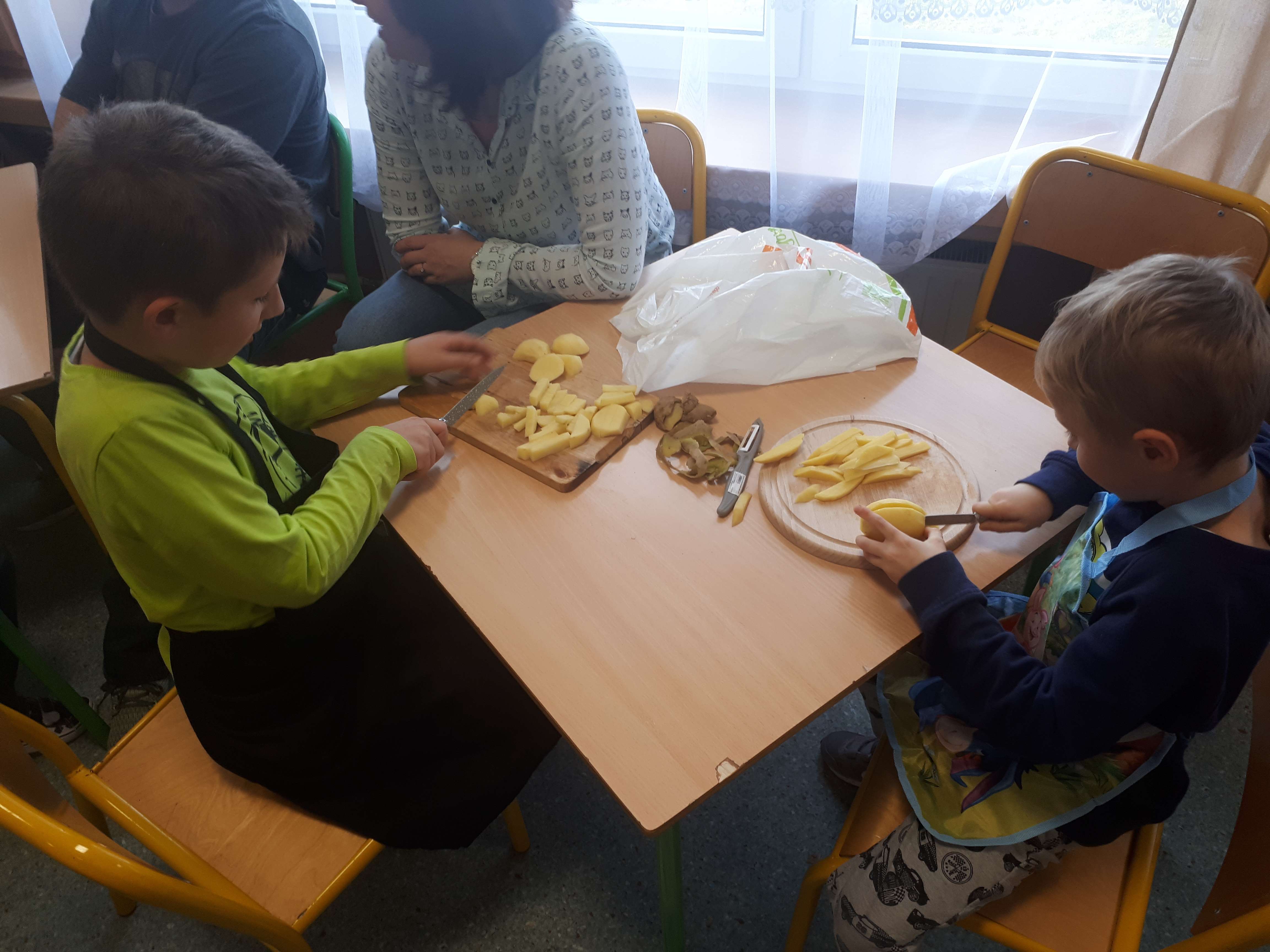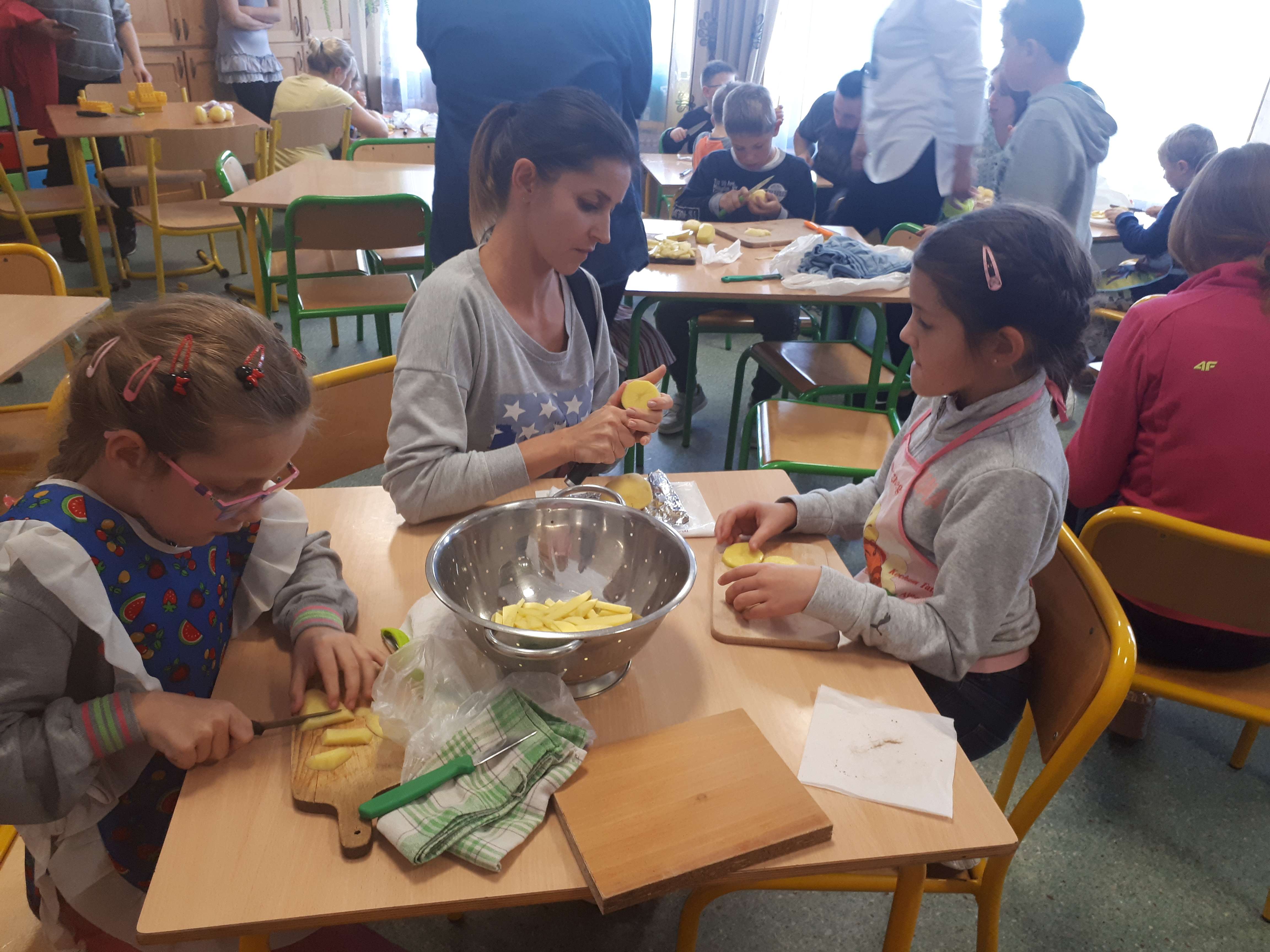 Dnia 15 listopada od godziny 13:30 do 16:30 po raz pierwszy w naszej szkole obchodziliśmy ŚWIĘTO ZIEMNIAKA, w którym brali udział uczniowie klas 1-8, ich rodzice i wychowawcy klas. Najpierw pani dyrektor zapoznała uczniów z „historią ziemniaka”. Wszyscy dowiedzieli się skąd pochodzi, jak nazywa się w różnych regionach Polski, z jakich części się składa, oraz jakie potrawy można z niego przygotować. Uczniowie obierali ziemniaki i odbył się konkurs na najdłuższe obierki. Potem każda klasa miała wykonać potrawę z ziemniaków. Uczniowie klasy 1 i 2 kroili obrane ziemniaki na frytki, które smażyli rodzice. Uczniowie klasy 3 zrobili pyszną sałatkę ziemniaczaną. Klasa 4 usmażyła chipsy. Klasa 5 miała za zadanie zrobienie moskoli. Uczniowie klasy 6 ucierali ziemniaki na placki ziemniaczane, które smażyli dorośli. Klasa 7 i 8 były odpowiedzialne za pieczenie ziemniaków w ognisku. Na koniec wszyscy chętnie częstowali się zrobionymi daniami z ziemniaków: frytkami, chipsami, plackami ziemniaczanymi, moskolami, sałatką ziemniaczaną i ziemniakami prosto z ogniska. Potrawy smakowały wybornie. Nikt, by się nie spodziewał, że tyle radości sprawi dzieciom tradycyjny ziemniak.