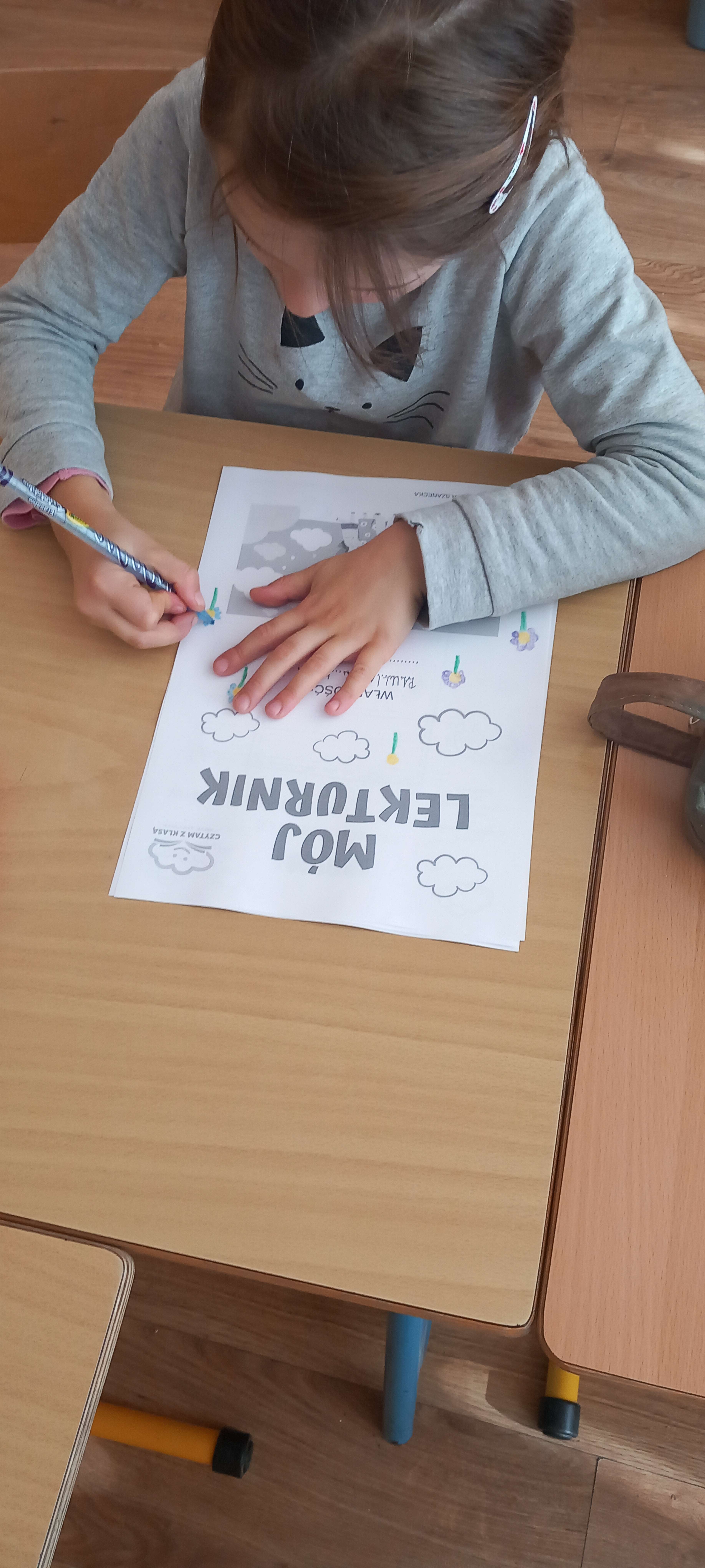 Kolejnym etapem było stworzenie „Lekturowego zegara”, w którym każda godzina symbolizowała inne ważne wydarzenie z przeczytanej lektury. To ćwiczenie pozwoliło uczniom utrwalić fabułę w sposób kreatywny i przystępny dla młodszych dzieci.