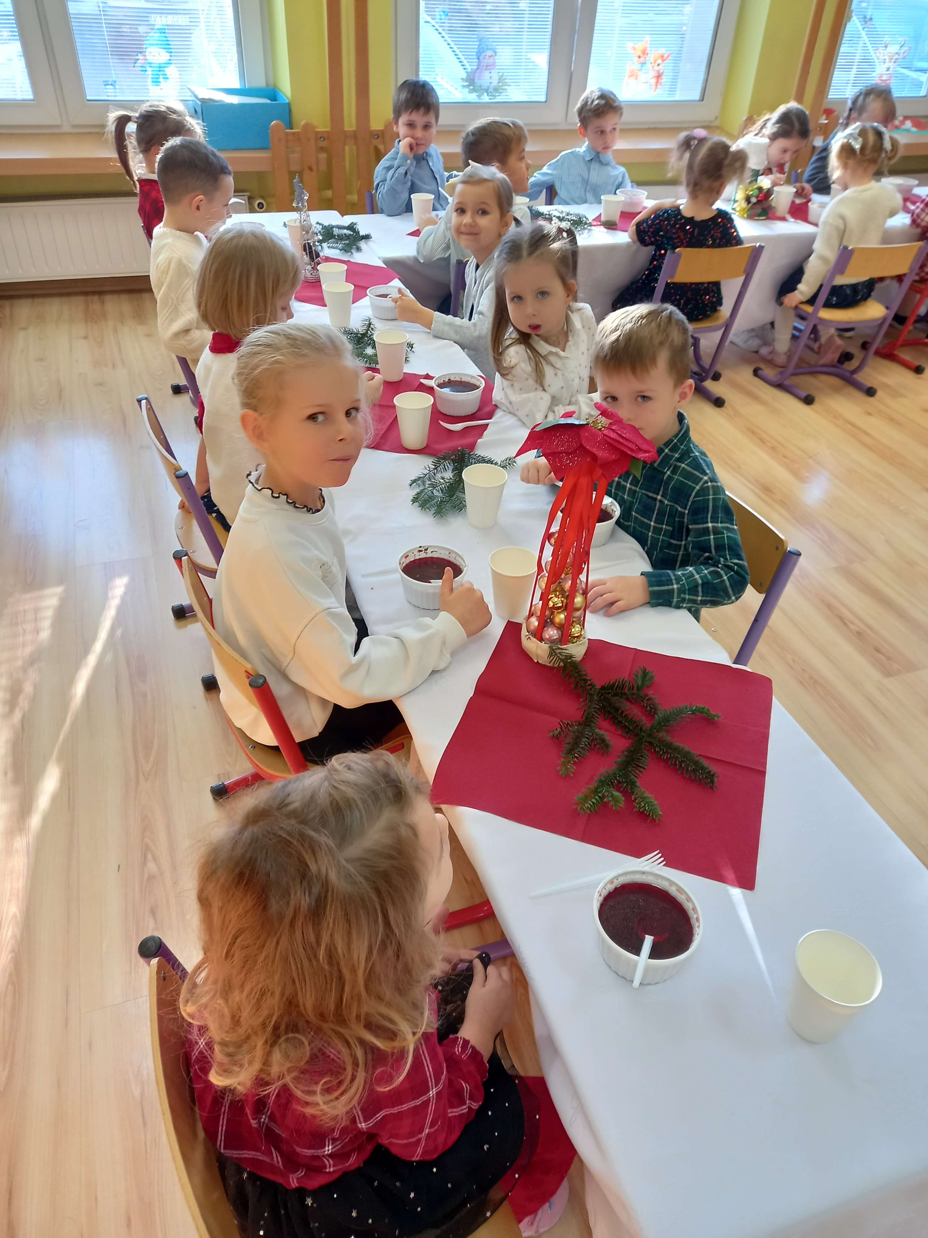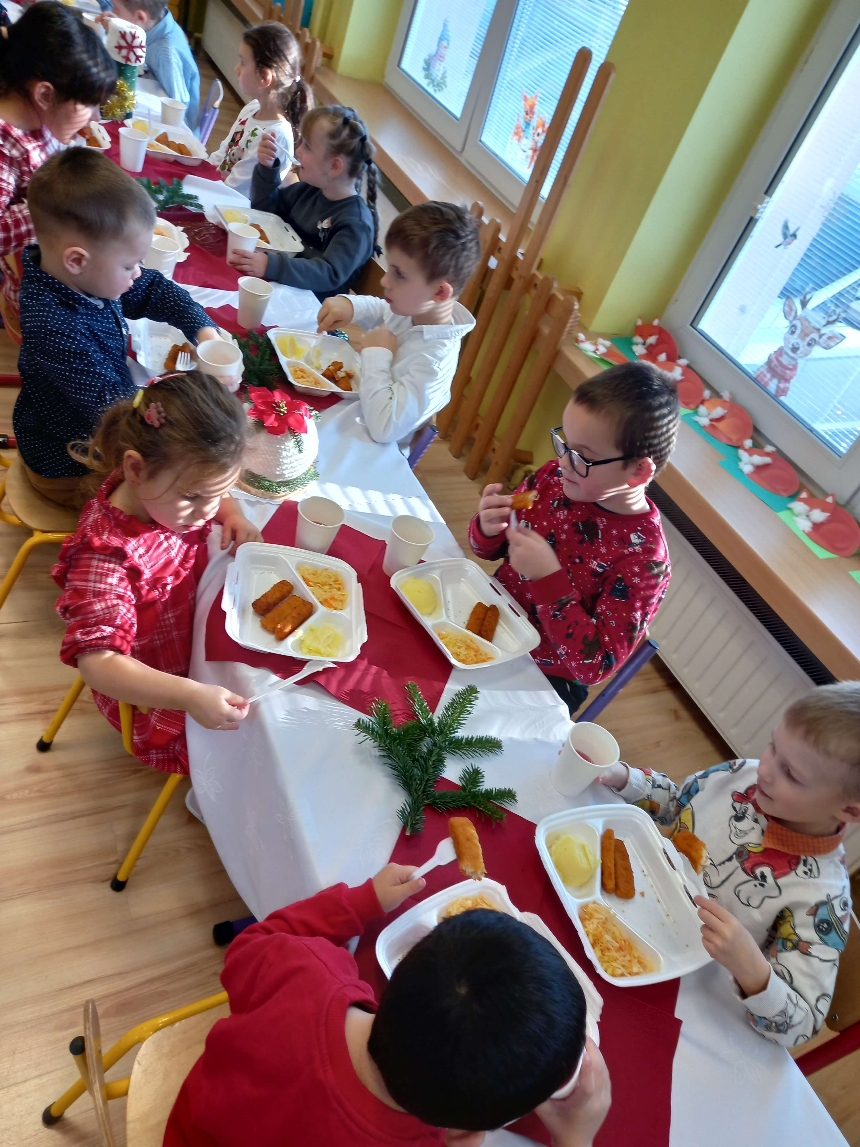 Czas oczekiwania na Święta Bożego Narodzenia zakończyła wspólna wigilia, która odbyła się 19 grudnia 2025 r. W sali przedszkolnej odświętnie ubrane przedszkolaki wysłuchały życzeń od swoich wychowawczyń, wspólnie kolędowały, dzieliły się opłatkiem oraz zjadły wigilijny obiad.