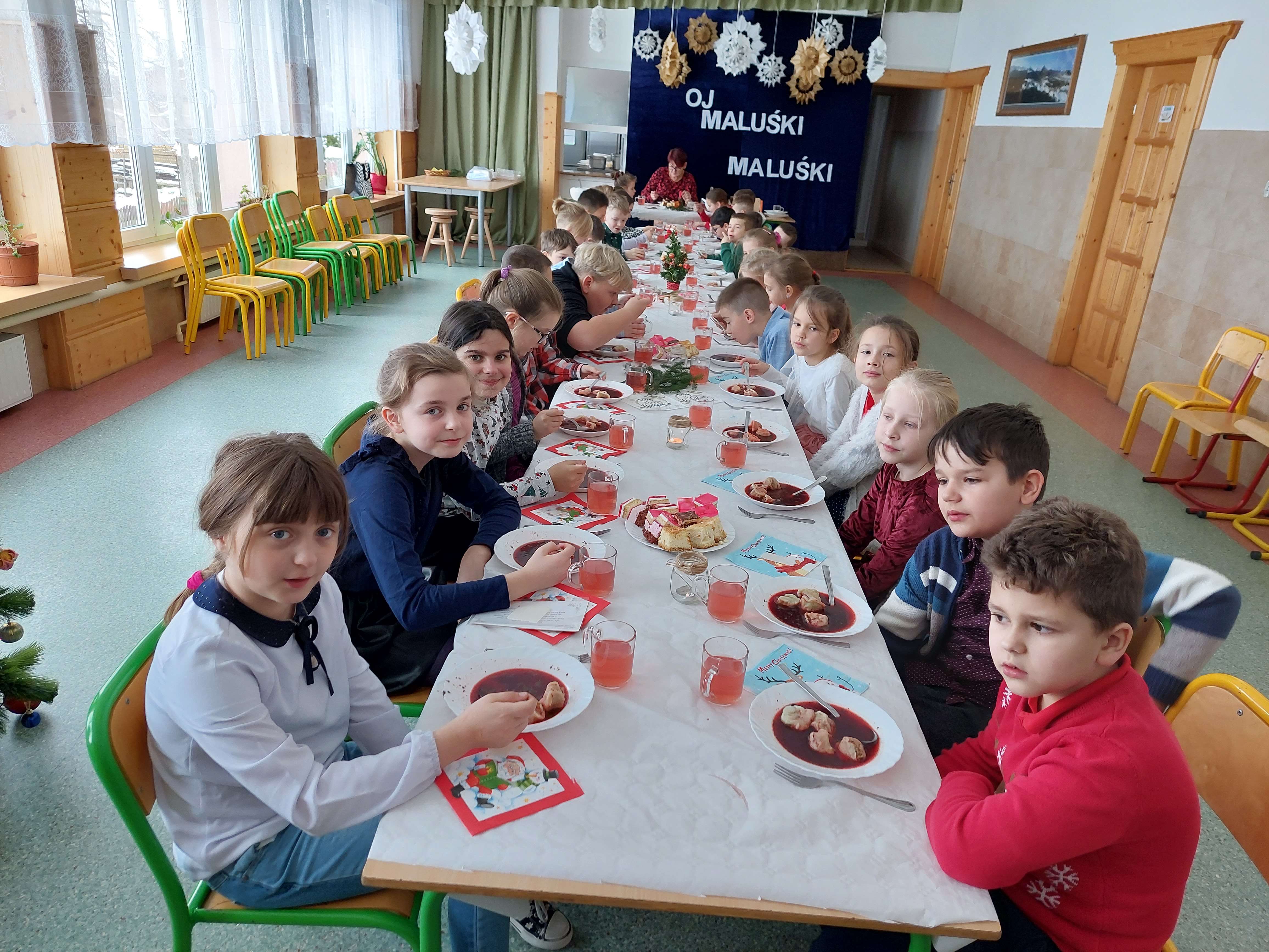 Okres świąt Bożego Narodzenia to czas szczególny. Aby podkreślić ich wyjątkowy charakter, już tradycyjnie, jak co roku, uczniowie klasy I-III pod opieką wychowawczyń pani Katarzyny Mucha, pani Beaty Sikory i pani Marii Łukaszczyk zorganizowały wigilię, którą rozpoczęto odczytaniem fragmentu ewangelii św. Łukasza – Narodzenie Jezusa. Następnie wychowawczynie przekazały uczniom życzenia świąteczne i noworoczne, a po nich wszyscy indywidualnie, nawzajem sobie składali życzenia. Na naszym świątecznym stole pojawiły się tradycyjne potrawy wigilijne spożywane w polskich domach między innymi barszcz czerwony z uszkami, ryba, kompot z suszu oraz ciasta. Nie zabrakło również śpiewania kolęd. To był inny dzień niż zwykle.