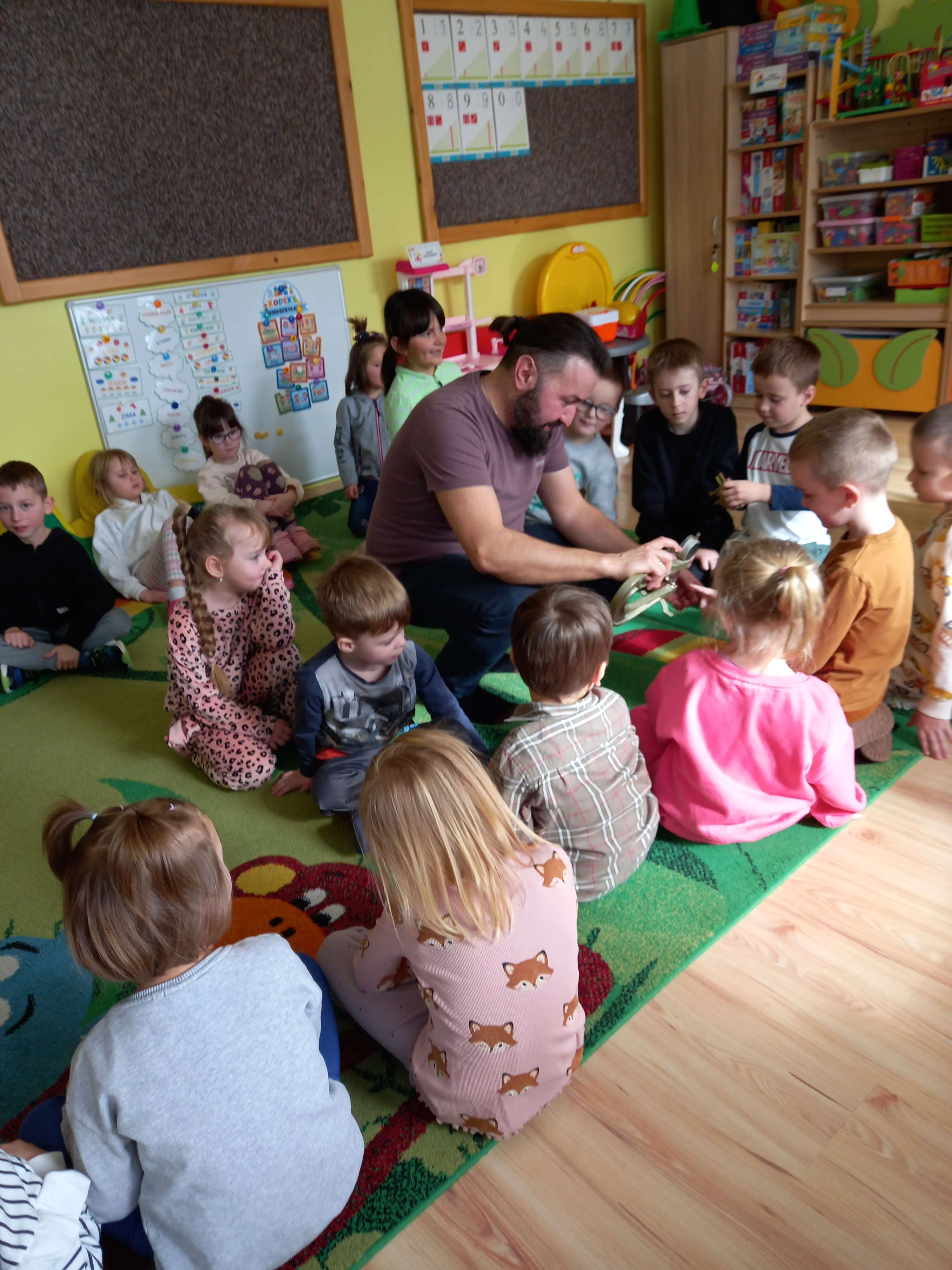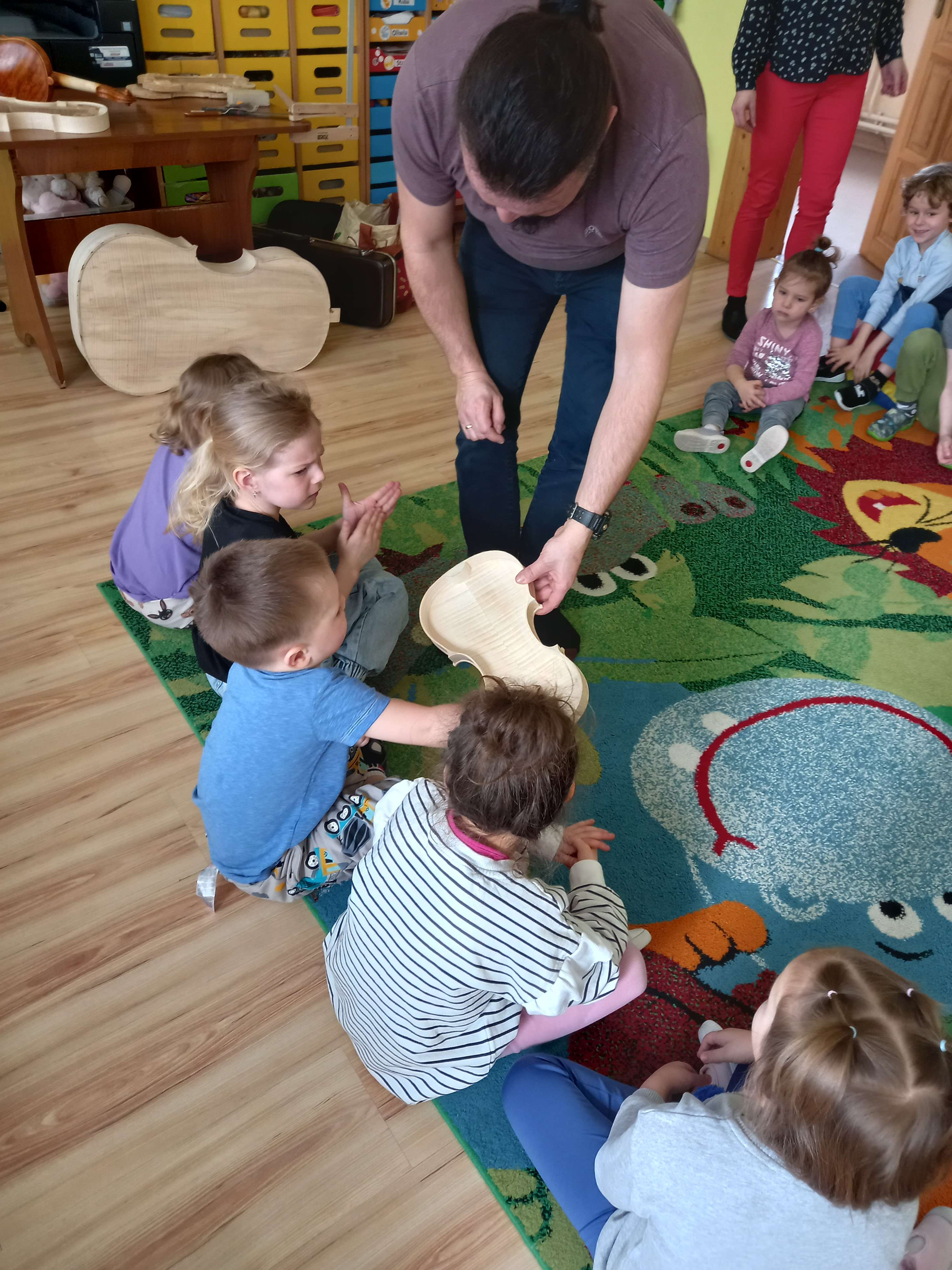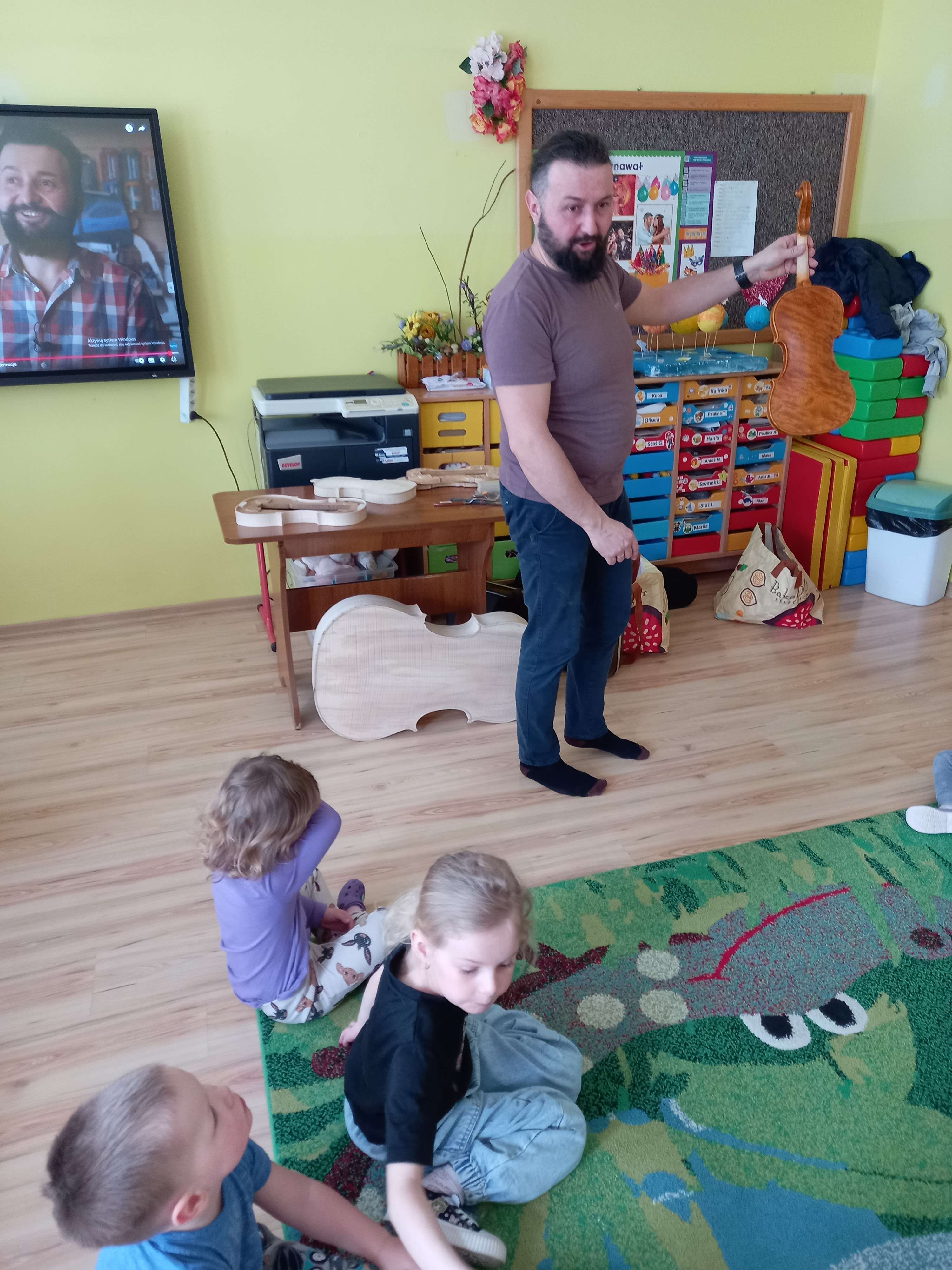 26 lutego nasz oddział przedszkolny odwiedził wyjątkowy gość. Był to tata Ani Migiel, pan Paweł, który wykonuje bardzo ciekawy zawód lutnika. Lutnik zajmuje się budową i naprawą szyjkowych instrumentów strunowych, do których należą: lutnie, skrzypce, altówki, kontrabasy, wiolonczele czy gitary. Lutnicy zajmują się konstruowaniem i renowacją instrumentów na indywidualne zamówienie klienta. Dzięki temu tworzone przez nich modele są dostosowane do potrzeb i indywidualnych preferencji danej osoby. .Do codziennych obowiązków lutników należy także serwisowanie sprzętu muzycznego oraz jego okresowe regulowanie. Pan Paweł szczegółowo opowiadał o swoim zawodzie, prezentował bardzo ciekawe egzemplarze swojej pracy. Przedszkolaki z zaciekawieniem oglądały sprzęt, potrzebny do tworzenia instrumentów.
