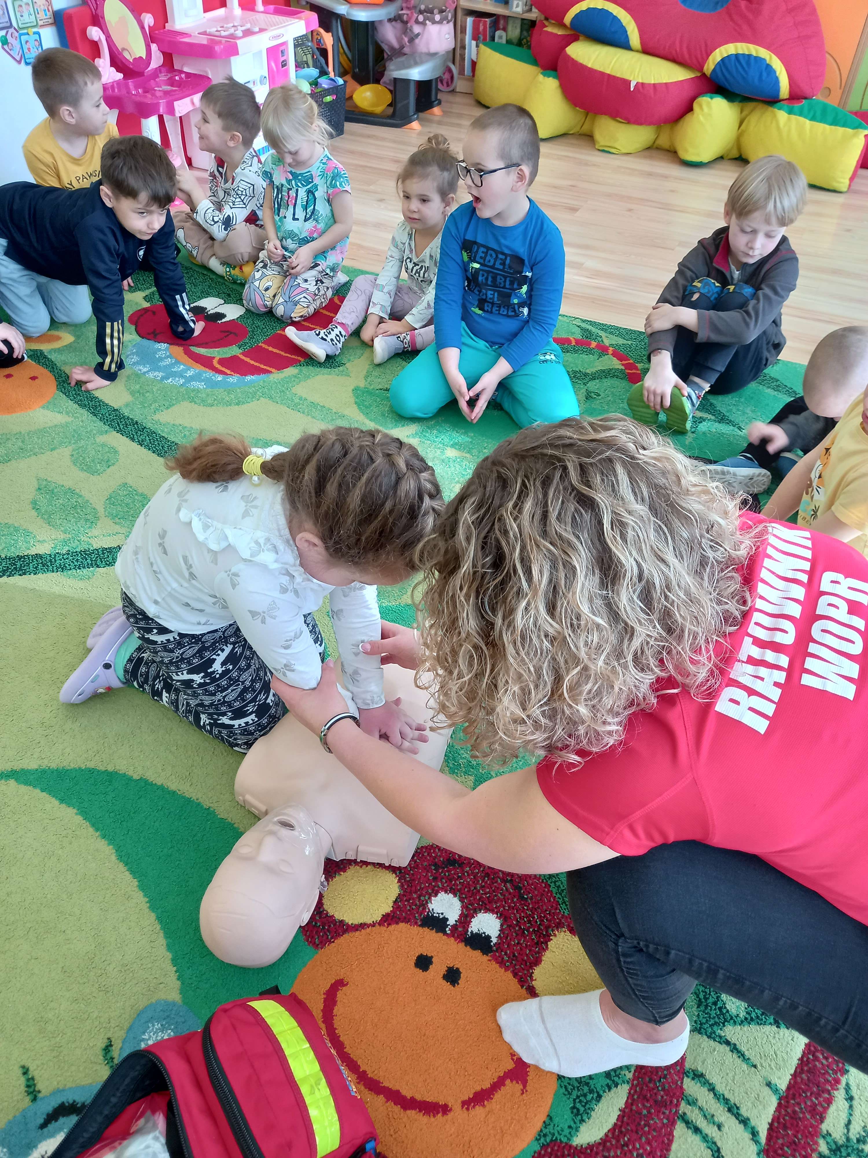 20 marca nasz oddział przedszkolny odwiedziła pani ratownik pokazała dzieciom jak wygląda strój, w którym pracuje na co dzień. Wyjaśniła na czym polega jej praca oraz czym zajmują się poszczególne służby ratunkowe. Następnie przedszkolaki miały okazję wysłuchać informacji na temat udzielania pierwszej pomocy. Poza tym dzieci utrwaliły sobie numery alarmowe oraz zasady bezpiecznej zabawy. W trakcie prowadzonych zajęć obserwowały również w jaki sposób należy prawidłowo wykonać opatrunek medyczny. Zdobyta wiedza i ćwiczenia praktyczne sprawiły, że przedszkolaki poczuły się “małymi ratownikami”.