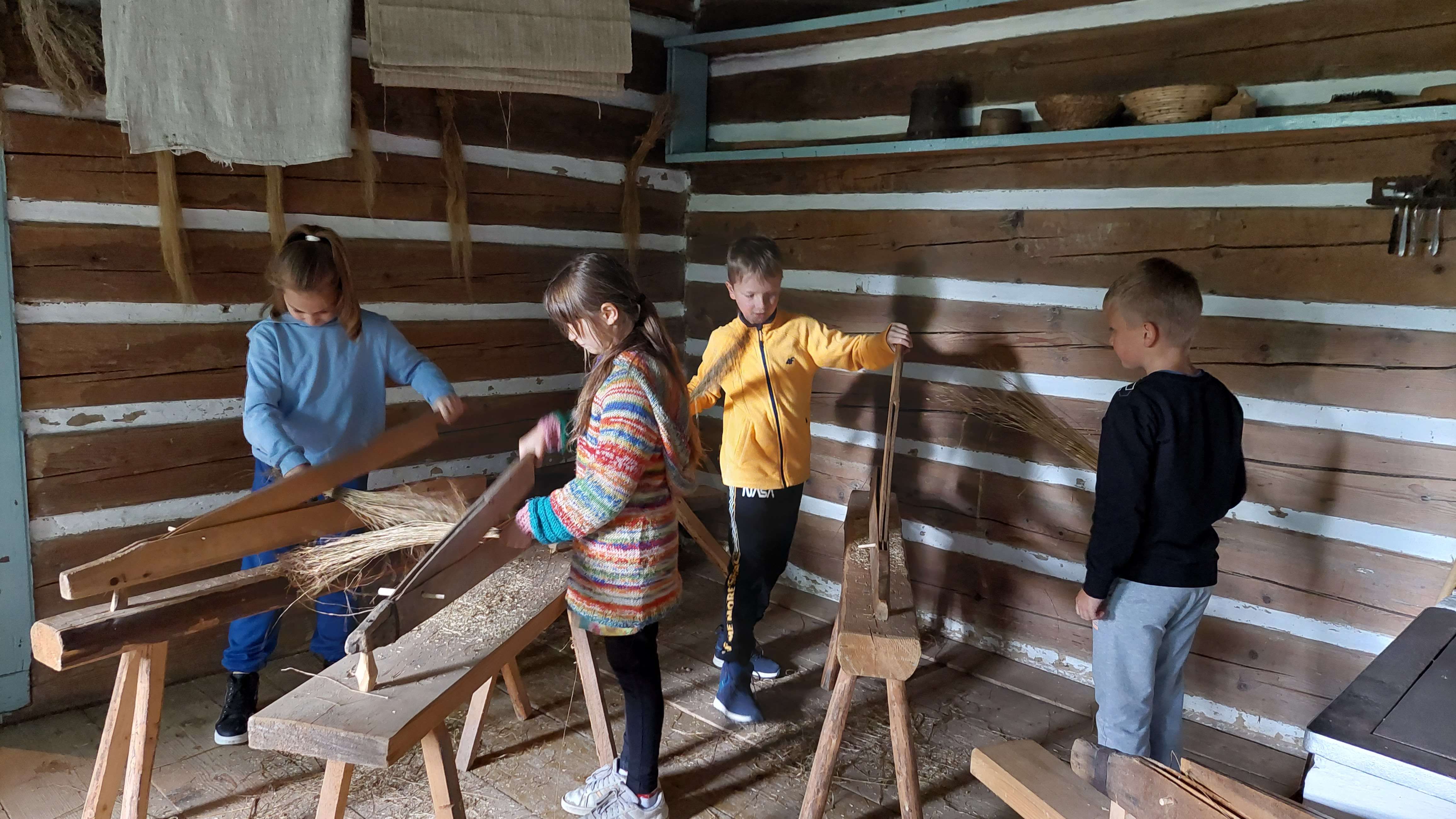 Uczniowie uczestniczyli w warsztatach na temat: „Jak to z lnem było”. O wyborze tematu zadecydowała jego istotna rola w gospodarce dawnej Orawy. Dzieci poznały szerokie zastosowanie lnu - wyrabiano z niego płótno, robiono powrozy, a z nasion wytłaczano tak bardzo potrzebny w gospodarstwie domowym olej. Pani Przewodnik opowiadała uczestnikom zarówno o znaczeniu lnu, jak i całym procesie jego obróbki. Pani Przewodnik pokazywała jak len rafać, tłuc, międlić i czesać tak, aby ze słomy lnianej uzyskać piękne, wyczesane włókno, które pozostało jako pamiątka z pobytu w Skansenie. Gdy pani skończyła pokaz każdy z uczniów przystępował do tych czynności samodzielnie pod czujnym okiem pani Przewodnik, a po zakończeniu całego procesu zabrał ze sobą swoje dzieło. Uczniowie po zakończeniu obróbki lnu udali się do jednej z chat Skansenu na projekcję filmu promocyjnego o powstaniu Parku i jego zabytkach.