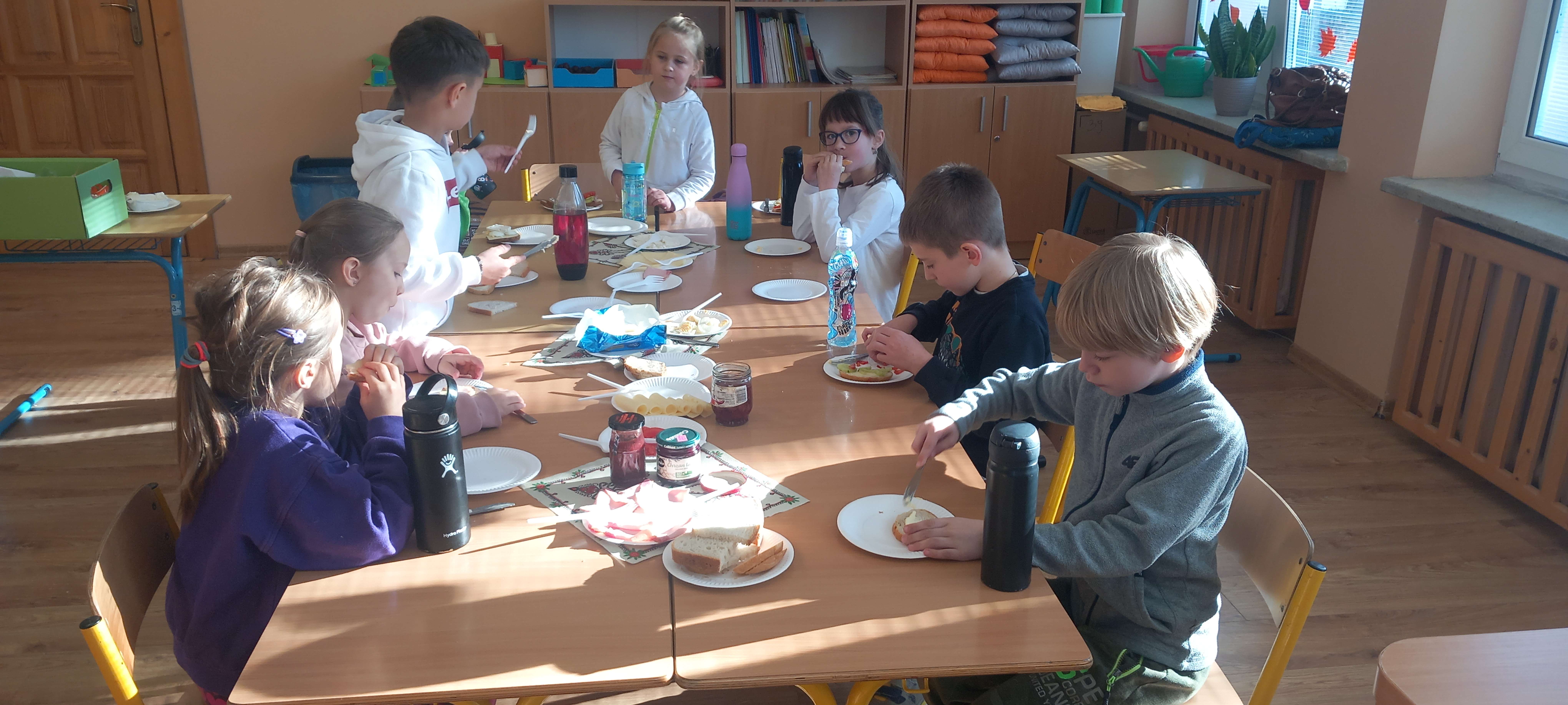 W ramach realizacji programu nauczania oraz zajęć poświęconych tematyce zdrowego odżywiania, uczniowie klasy I przygotowali w swojej sali wspólne, zdrowe śniadanie.